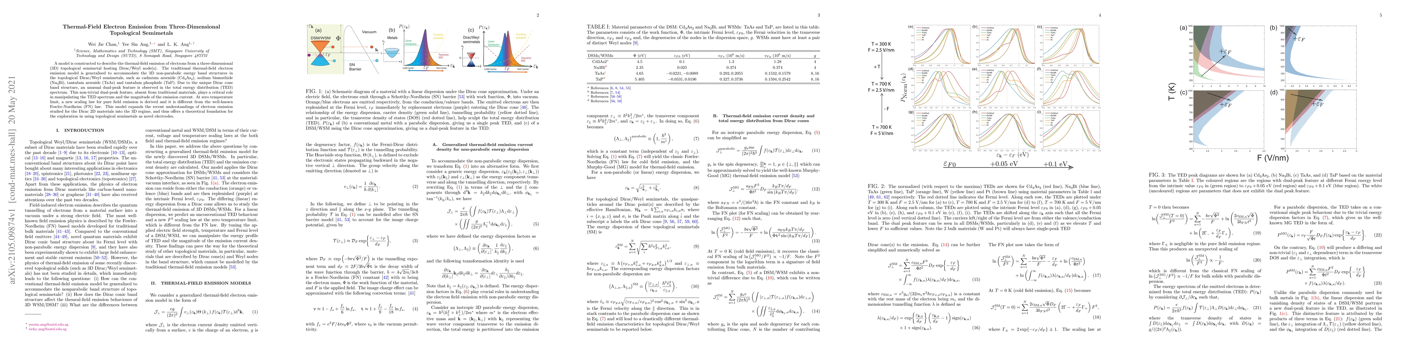 This paper constructs a generalized thermal-field electron emission model for three-dimensional topological semimetals, revealing a dual-peak feature in the total energy distribution spectrum due to their unique Dirac cone band structure. It introduces a new scaling law for pure field emission, distinct from the Fowler-Nordheim law, providing a theoretical basis for utilizing these materials as novel electrodes.