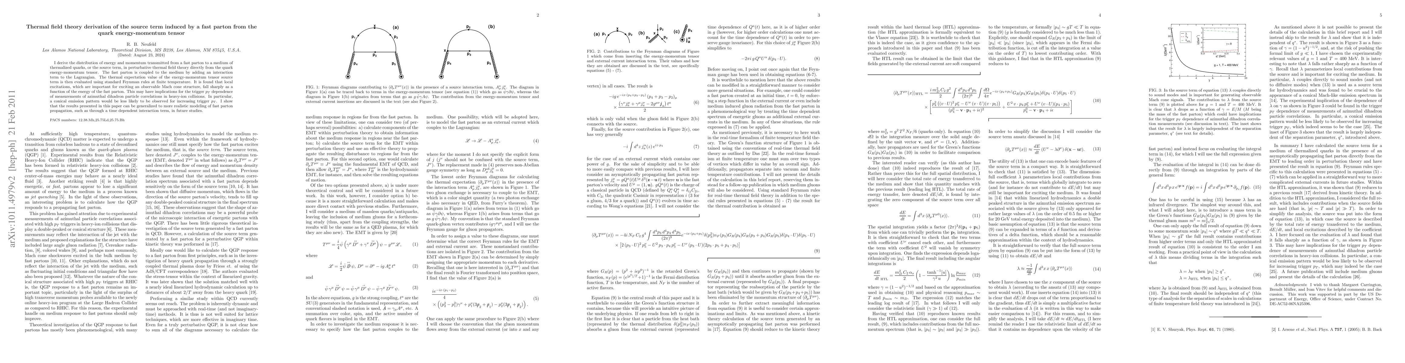 I derive the distribution of energy and momentum transmitted from a fast parton to a medium of thermalized quarks, or the source term, in perturbative thermal field theory directly from the quark energy-momentum tensor. The fast parton is coupled to the medium by adding an interaction term to the Lagrangian. The thermal expectation value of the energy-momentum tensor source term is then evaluated using standard Feynman rules at finite temperature. It is found that local excitations, which are important for exciting an observable Mach cone structure, fall sharply as a function of the energy of the fast parton. This may have implications for the trigger $p_T$ dependence of measurements of azimuthal dihadron particle correlations in heavy-ion collisions. In particular, a conical emission pattern would be less likely to be observed for increasing trigger $p_T$. I show that the results presented in this paper can be generalized to more realistic modeling of fast parton propagation, such as through a time dependent interaction term, in future studies.
