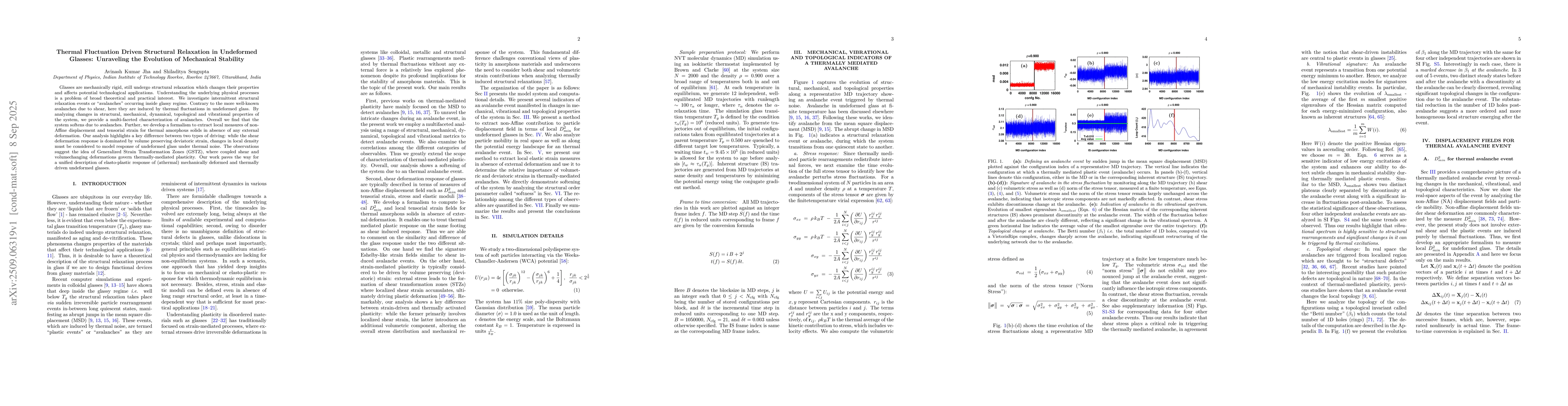 Glasses are mechanically rigid, still undergo structural relaxation which changes their properties and affects potential technological applications. Understanding the underlying physical processes is a problem of broad theoretical and practical interest. We investigate intermittent structural relaxation events or ``avalanches'' occurring inside glassy regime. Contrary to the more well-known avalanches due to shear, here they are induced by thermal fluctuations in undeformed glass. By analyzing changes in structural, mechanical, dynamical, topological and vibrational properties of the system, we provide a multi-faceted characterization of avalanches. Overall we find that the system softens due to avalanches. Further, we develop a formalism to extract local measures of non-Affine displacement and tensorial strain for thermal amorphous solids in absence of any external deformation. Our analysis highlights a key difference between two types of driving: while the shear deformation response is dominated by volume preserving deviatoric strain, changes in local density must be considered to model response of undeformed glass under thermal noise. The observations suggest the idea of Generalized Strain Transformation Zones (GSTZ), where coupled shear and volume-changing deformations govern thermally-mediated plasticity. Our work paves the way for a unified description of elasto-plastic response of (athermal) mechanically deformed and thermally driven undeformed glasses.