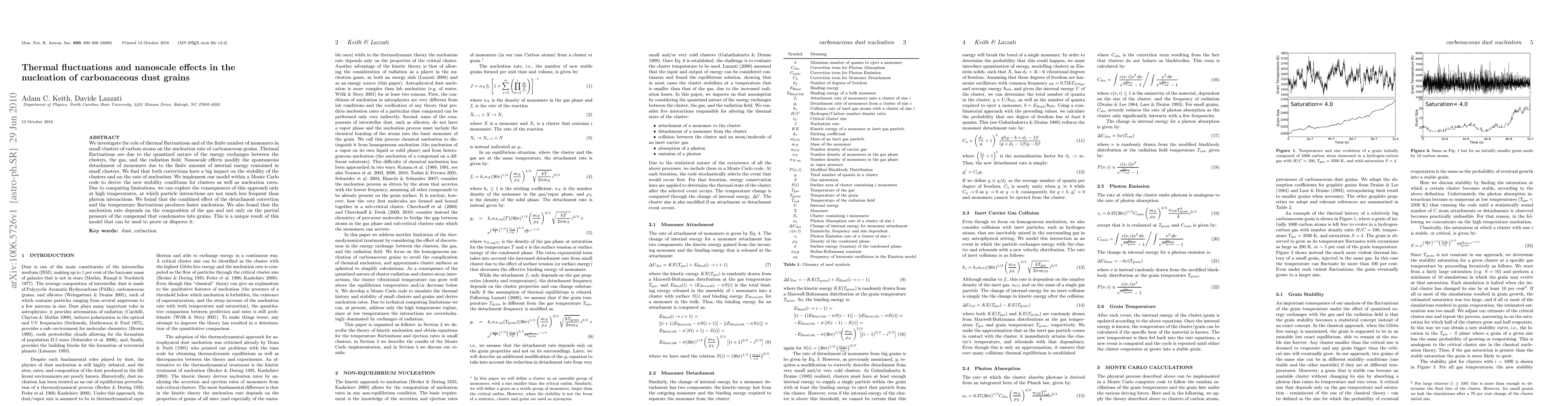 We investigate the role of thermal fluctuations and of the finite number of monomers in small clusters of carbon atoms on the nucleation rate of carbonaceous grains. Thermal fluctuations are due to the quantized nature of the energy exchanges between the clusters, the gas, and the radiation field. Nanoscale effects modify the spontaneous detachment of monomers due to the finite amount of internal energy contained in small clusters. We find that both corrections have a big impact on the stability of the clusters and on the rate of nucleation. We implement our model within a Monte Carlo code to derive the new stability conditions for clusters as well as nucleation rates. Due to computing limitations, we can explore the consequences of this approach only at high temperatures, at which particle interactions are not much less frequent than photon interactions. We found that the combined effect of the detachment correction and the temperature fluctuations produces faster nucleation. We also found that the nucleation rate depends on the composition of the gas and not only on the partial pressure of the compound that condensates into grains. This is a unique result of this model that can be used to prove or disprove it.