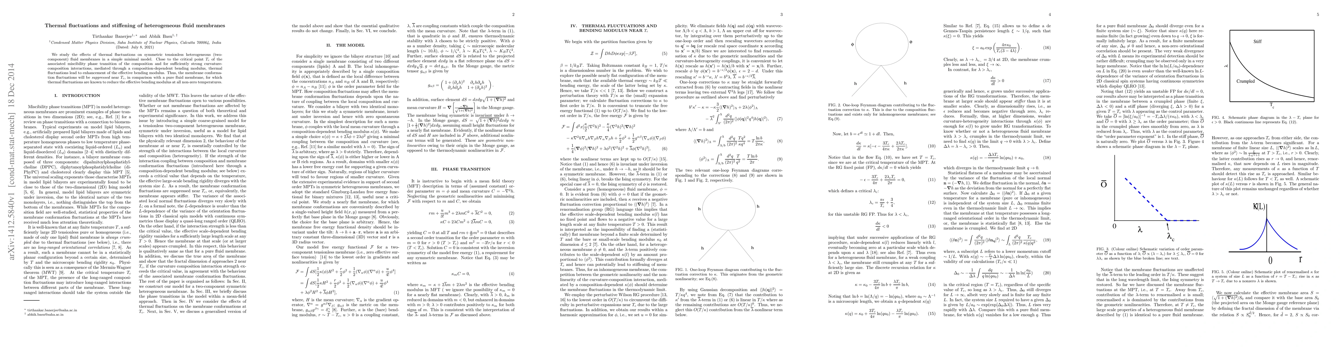 This paper investigates how thermal fluctuations affect the stiffness of heterogeneous fluid membranes near their critical miscibility phase transition point. It finds that near $T_c$, strong curvature-composition interactions enhance the effective bending modulus, resulting in suppressed membrane conformational fluctuations compared to pure fluid membranes.