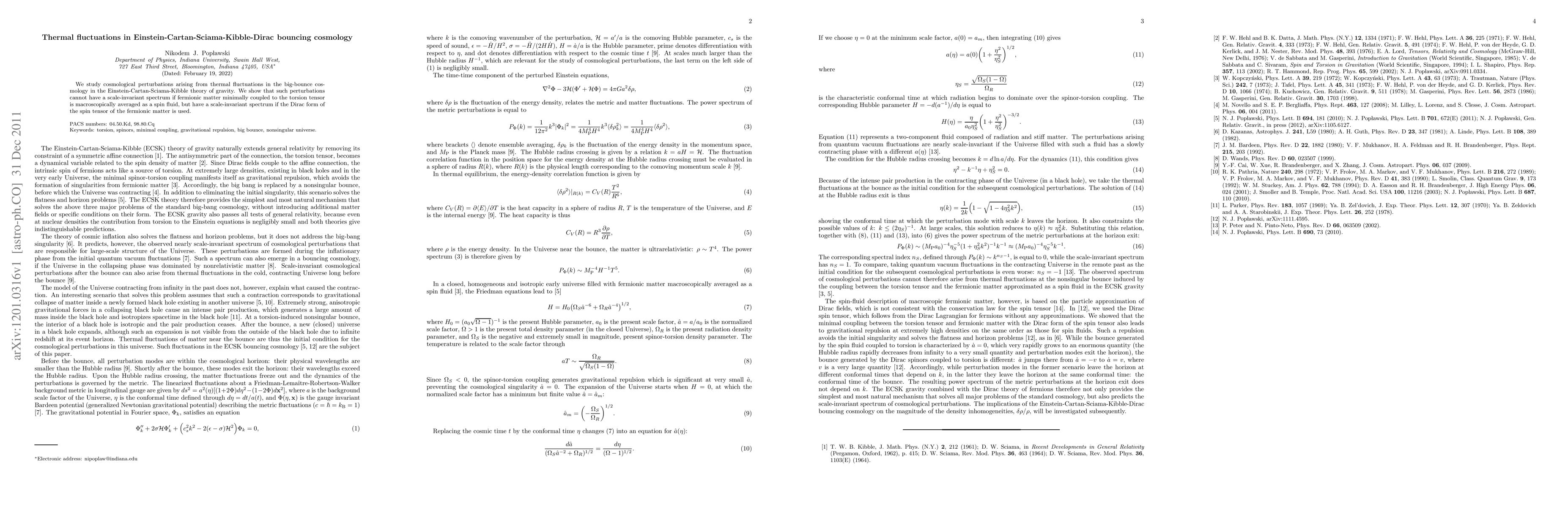 Summary: This paper investigates cosmological perturbations from thermal fluctuations in Einstein-Cartan-Sciama-Kibble theory's big-bounce cosmology, revealing that fermionic matter averaged as a spin fluid leads to non-scale-invariant perturbations, while using the Dirac form of the spin tensor results in a scale-invariant spectrum.