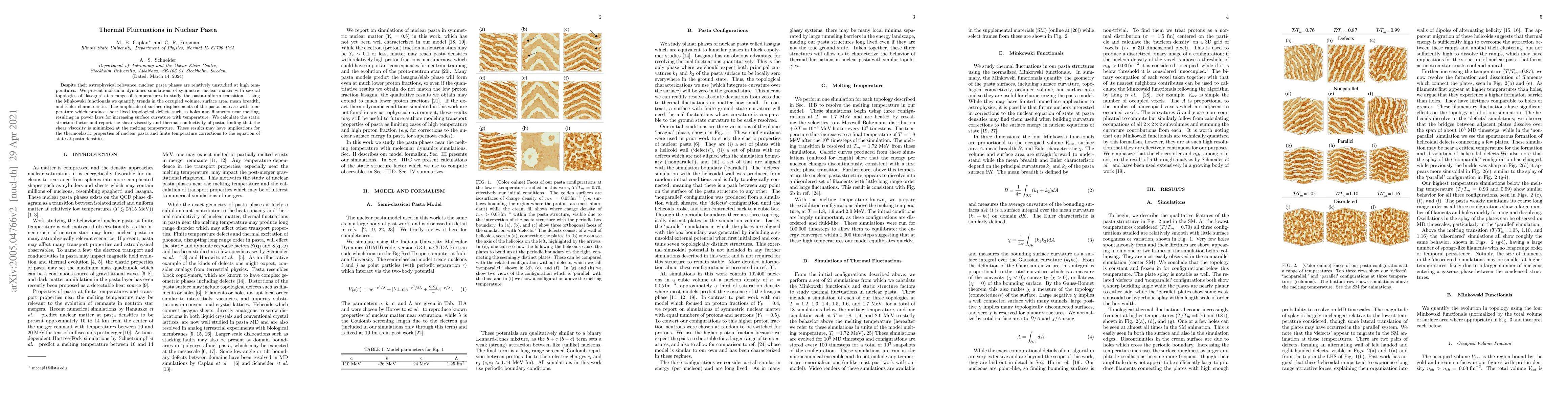 Despite their astrophysical relevance, nuclear pasta phases are relatively unstudied at high temperatures. We present molecular dynamics simulations of symmetric nuclear matter with several topologies of `lasagna' at a range of temperatures to study the pasta-uniform transition. Using the Minkowski functionals we quantify trends in the occupied volume, surface area, mean breadth, and Euler characteristic. The amplitude of surface displacements of the pasta increase with temperature which produce short lived topological defects such as holes and filaments near melting, resulting in power laws for increasing surface curvature with temperature. We calculate the static structure factor and report the shear viscosity and thermal conductivity of pasta, finding that the shear viscosity is minimized at the melting temperature. These results may have implications for the thermoelastic properties of nuclear pasta and finite temperature corrections to the equation of state at pasta densities.