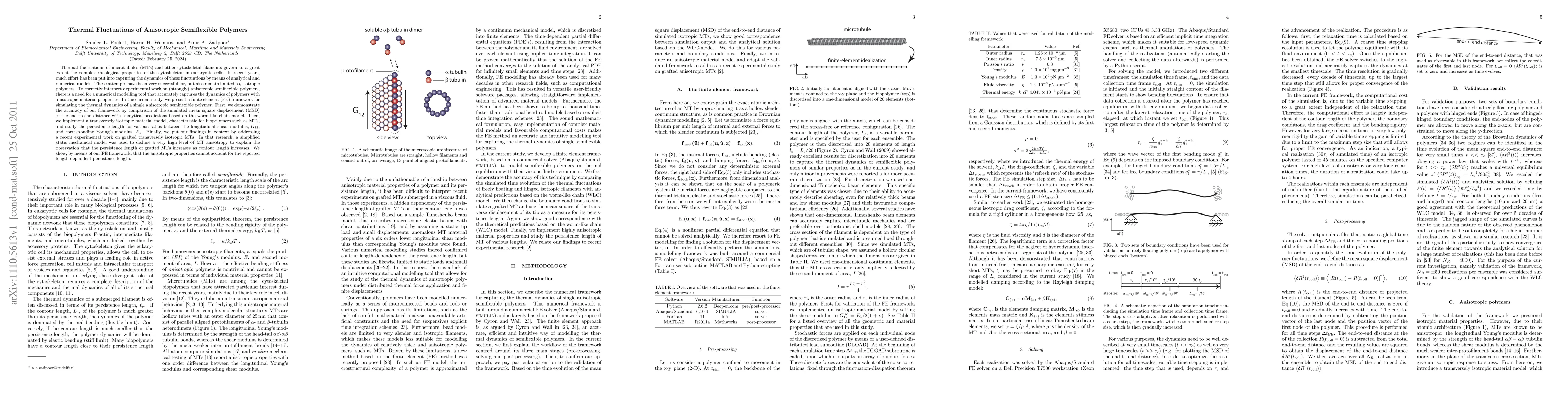 This paper presents a finite element framework to simulate thermal fluctuations in anisotropic semiflexible polymers, specifically microtubules, and compares its results with analytical models and experimental observations. The study finds that the anisotropic properties of the polymers do not explain the observed length-dependent increase in persistence length.