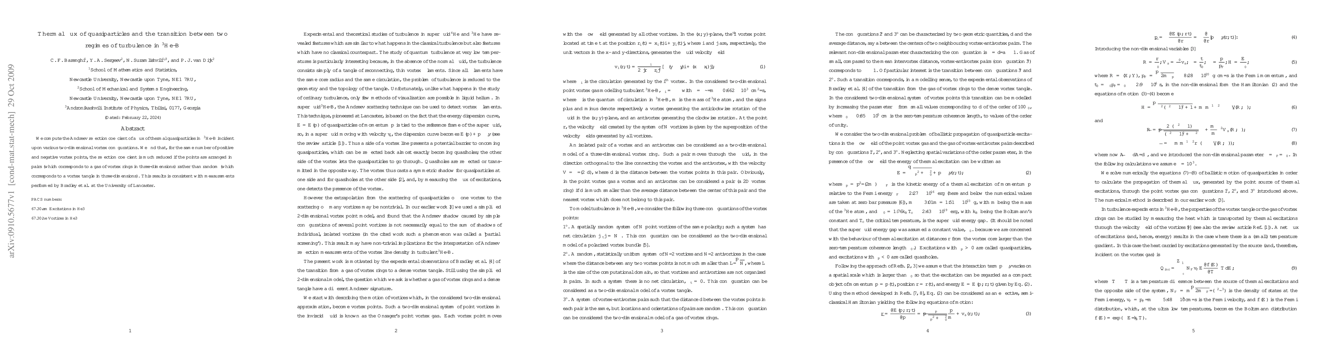 We compute the Andreev reflection coefficient of a flux of thermal quasiparticles in He3-B incident upon various two-dimensional vortex configurations. We find that, for the same number of positive and negative vortex points, the reflection coefficient is much reduced if the points are arranged in pairs (which corresponds to a gas of vortex rings in three-dimensions) rather than random (which corresponds to a vortex tangle in three-dimensions). This results is consistent with measurements performed by Bradley et al. at the University of Lancaster.