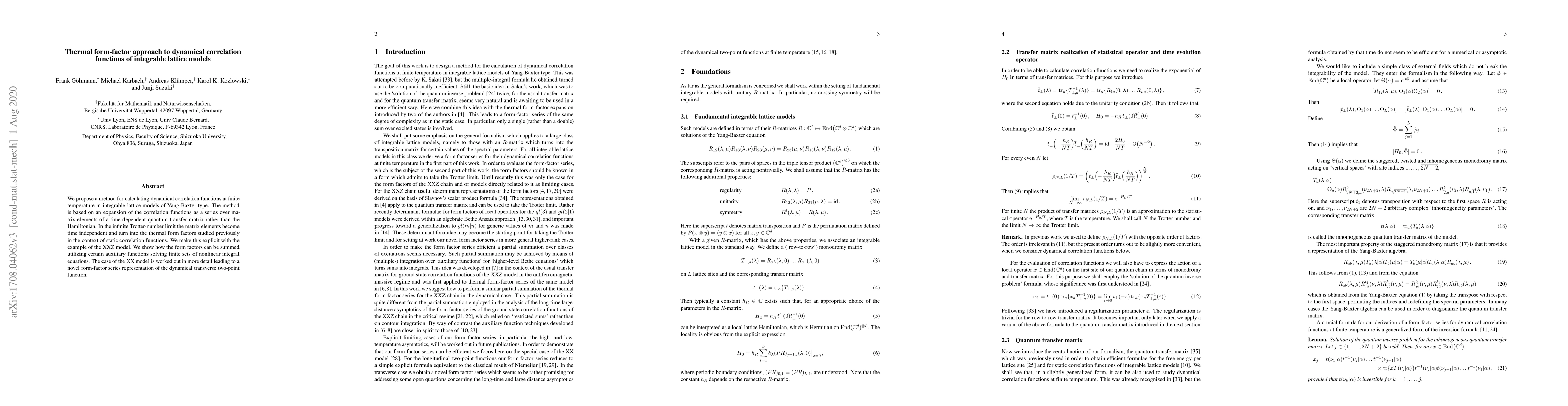 This paper introduces a thermal form-factor approach to calculate dynamical correlation functions in integrable lattice models, expanding them via matrix elements of a time-dependent quantum transfer matrix. The method is exemplified with the XXZ model and detailed for the XX model, revealing a novel series representation for the dynamical transverse two-point function.