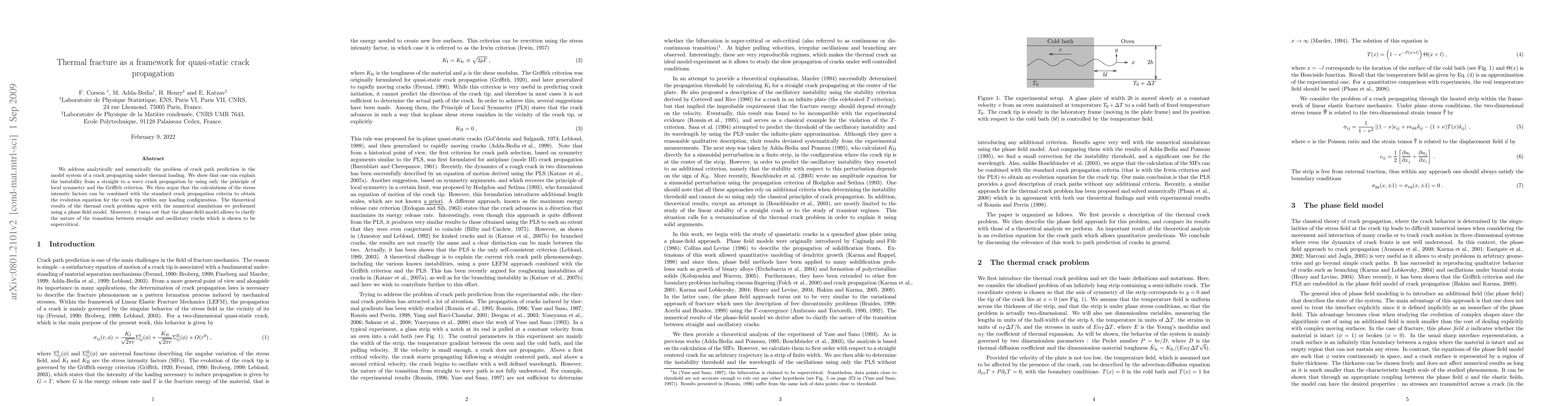 This paper explores the quasi-static crack propagation under thermal loading, demonstrating that the transition from straight to wavy crack paths can be explained using local symmetry and Griffith's criterion. The study combines stress intensity factor calculations with standard propagation criteria to derive an evolution equation for crack tips, validated by phase-field model simulations, which reveal a supercritical transition in crack behavior.