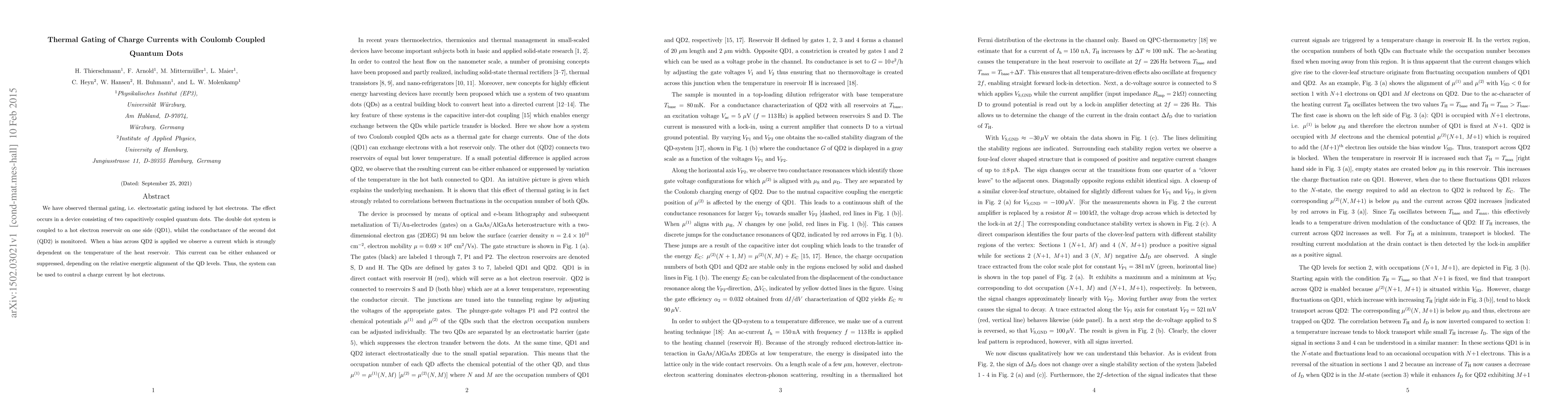This paper demonstrates thermal gating in a device with two capacitively coupled quantum dots, where hot electrons induce electrostatic gating. The current through the second dot is strongly temperature-dependent, allowing control over charge currents via the energetic alignment of quantum dot levels.