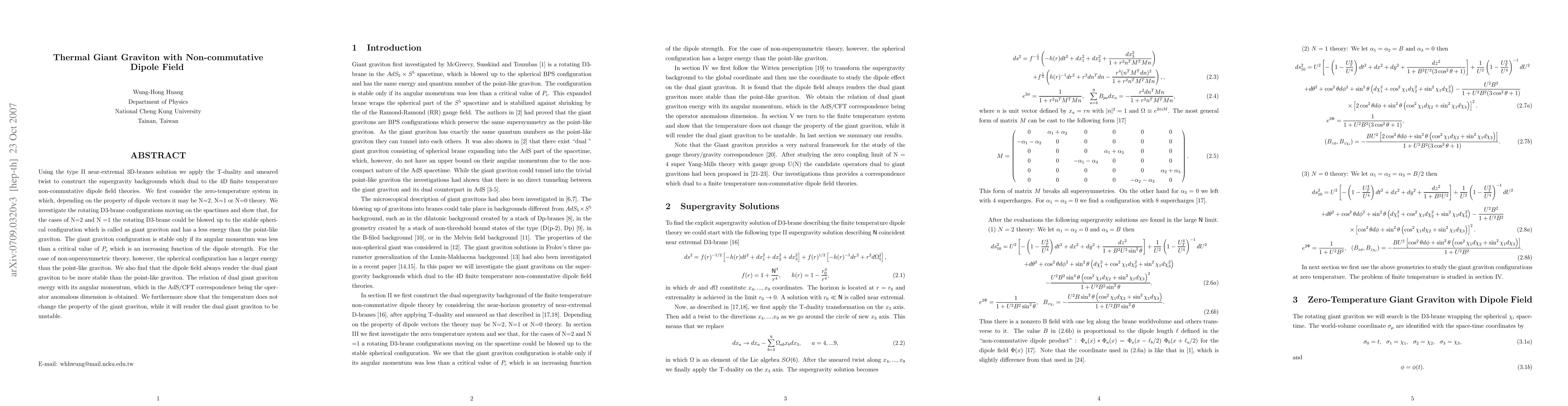 This paper constructs supergravity backgrounds dual to finite temperature non-commutative dipole field theories using T-duality and smeared twist. It finds that rotating D3-brane configurations can form stable giant gravitons with lower energy than point-like gravitons, provided their angular momentum is below a critical value dependent on dipole strength. The dipole field enhances the stability of the giant graviton.
