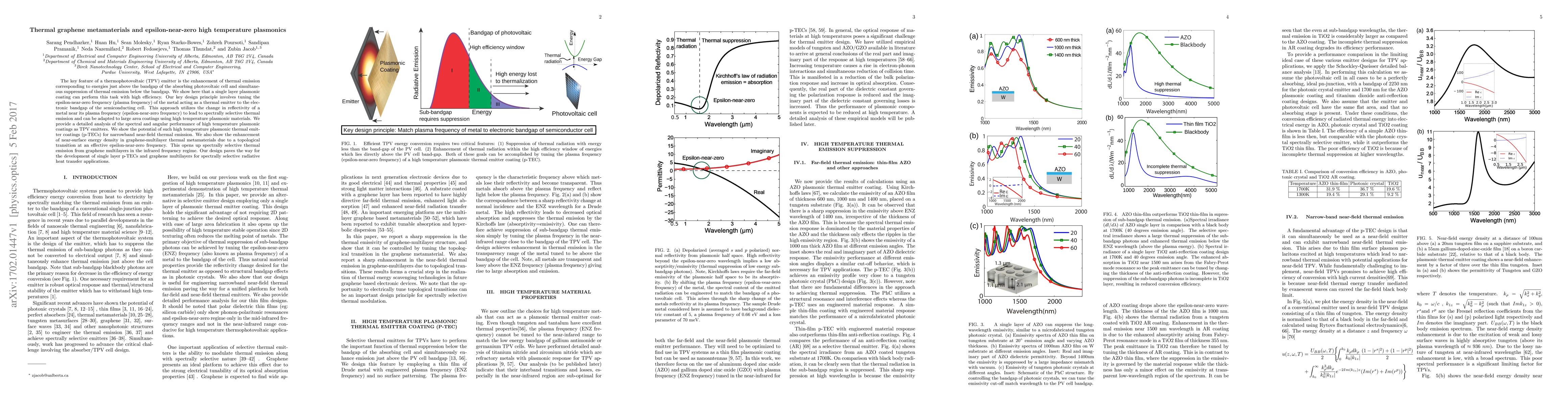 This paper explores the use of thermal graphene metamaterials and high temperature plasmonics to enhance thermophotovoltaic (TPV) emitters. It demonstrates that a single layer plasmonic coating can efficiently manage thermal emission, leveraging the epsilon-near-zero frequency for spectrally selective thermal emission, paving the way for advanced radiative heat transfer applications.
