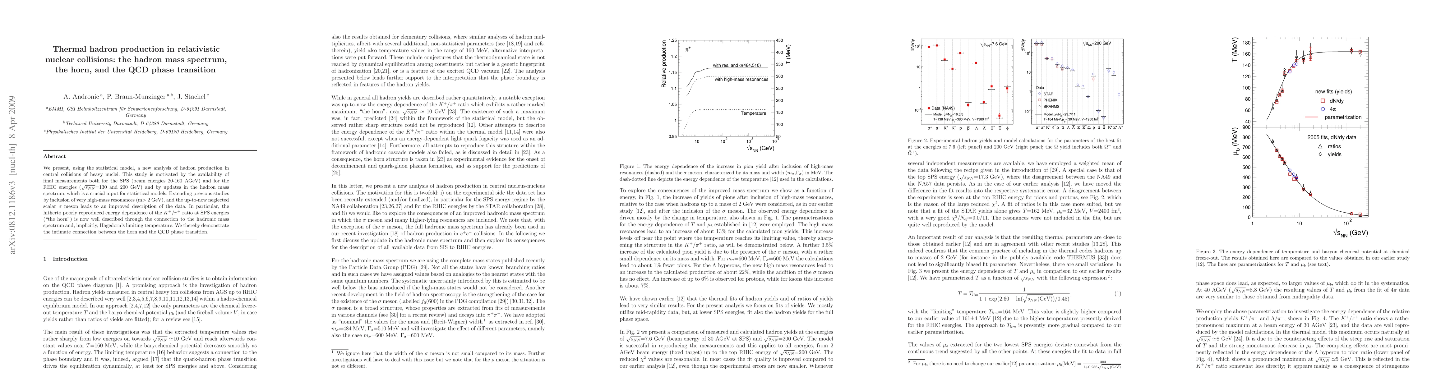 We present, using the statistical model, a new analysis of hadron production in central collisions of heavy nuclei. This study is motivated by the availability of final measurements both for the SPS (beam energies 20-160 AGeV) and for the RHIC energies ($\sqrt{s_{NN}}$=130 and 200 GeV) and by updates in the hadron mass spectrum, which is a crucial input for statistical models. Extending previous studies by inclusion of very high-mass resonances (m> 2 GeV), and the up-to-now neglected scalar $\sigma$ meson leads to an improved description of the data. In particular, the hitherto poorly reproduced energy dependence of the $K^+/\pi^+$ ratio at SPS energies ("the horn") is now well described through the connection to the hadronic mass spectrum and, implicitly, Hagedorn's limiting temperature. We thereby demonstrate the intimate connection between the horn and the QCD phase transition.