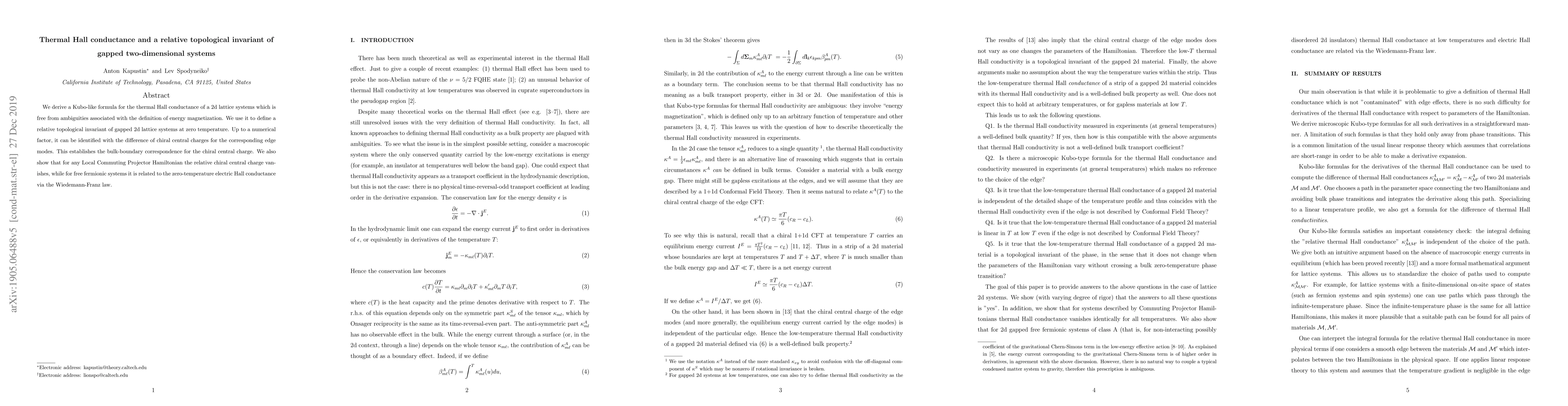 This paper derives a precise formula for the thermal Hall conductance in 2D lattice systems, establishing a relative topological invariant linked to the difference in chiral central charges of edge modes. It confirms the bulk-boundary correspondence for the chiral central charge and shows its vanishing for Local Commuting Projector Hamiltonians.