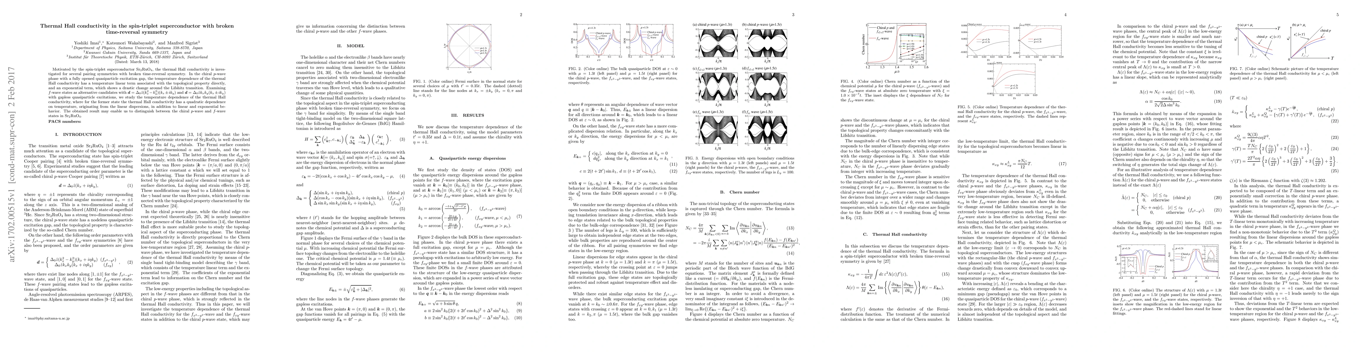 This paper investigates thermal Hall conductivity in spin-triplet superconductors with broken time-reversal symmetry, focusing on Sr2RuO4. It finds that the chiral p-wave phase exhibits a temperature-linear term and an exponential term in thermal Hall conductivity, while f-wave states show a quadratic temperature dependence, potentially aiding in distinguishing these phases.