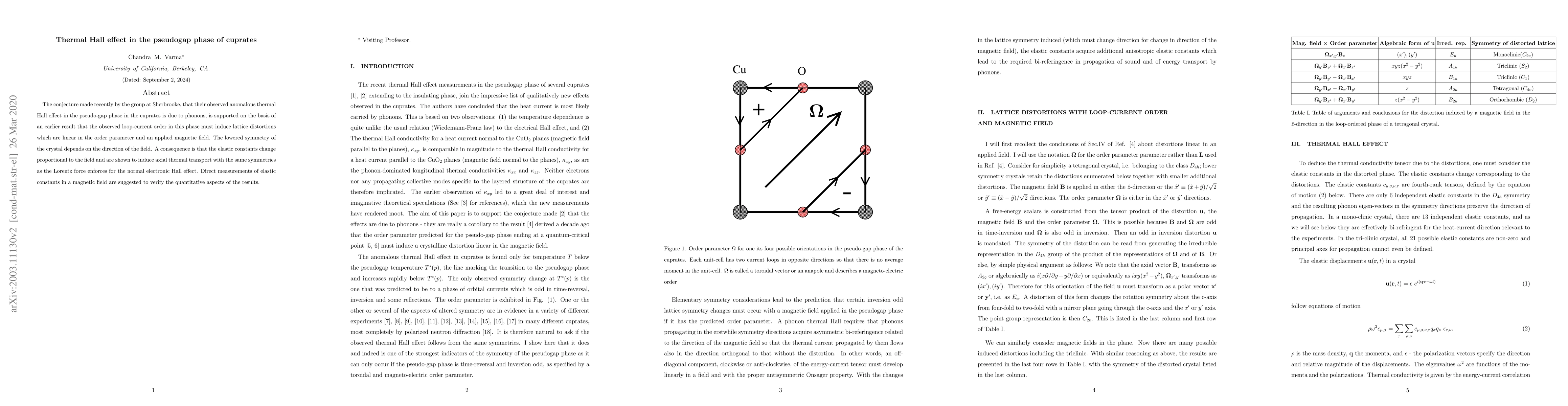 This paper supports the hypothesis that the anomalous thermal Hall effect in the pseudogap phase of cuprates is phonon-induced due to lattice distortions from loop-current order, which alters elastic constants in a field-dependent manner, leading to axial thermal transport akin to the electronic Hall effect. Verification through direct elastic constant measurements in a magnetic field is proposed.