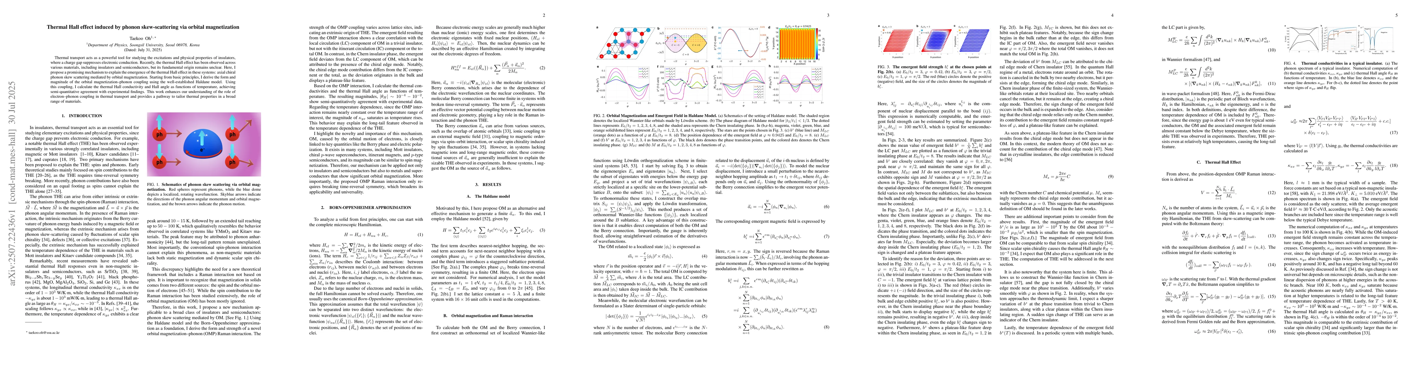The paper introduces a novel mechanism for the thermal Hall effect in insulators and semiconductors, mediated by orbital magnetization and phonon skew scattering, and derives the thermal Hall conductivity and Hall angle using the Haldane model.