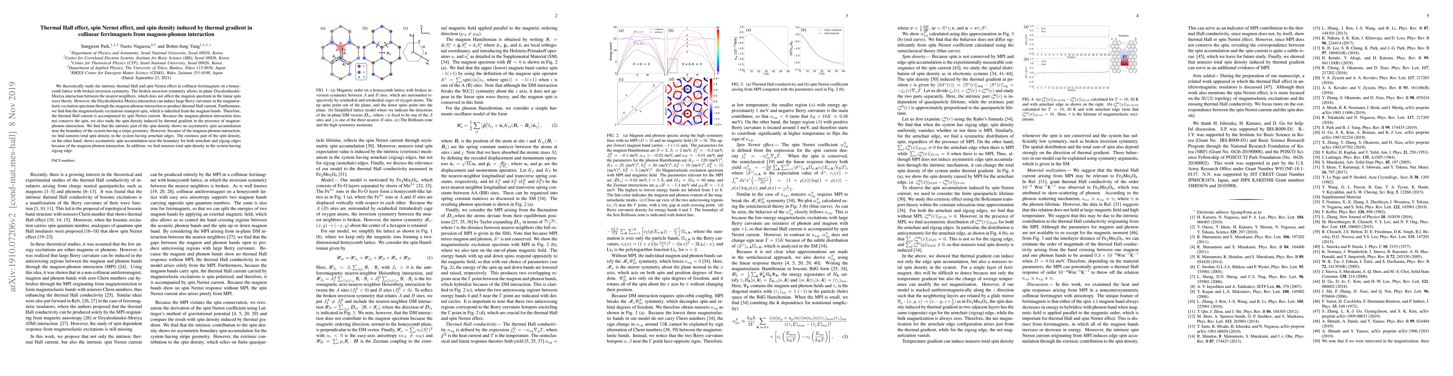 This paper theoretically investigates the intrinsic thermal Hall and spin Nernst effects in collinear ferrimagnets on a honeycomb lattice, attributing these phenomena to magnon-phonon interactions that induce large Berry curvature and spin transport. It also explores the spin density effects due to thermal gradients, finding non-zero spin density in systems with specific edge geometries.