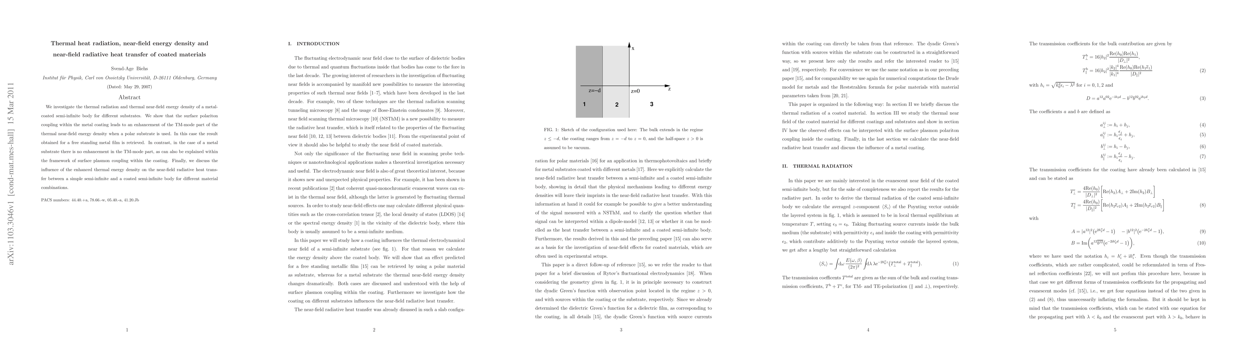 This paper examines thermal radiation and near-field energy density in metal-coated bodies with various substrates, finding enhanced TM-mode near-field energy density with polar substrates due to surface polariton coupling, while no enhancement occurs with metal substrates due to surface plasmon coupling. It also explores the impact of this enhanced energy density on near-field radiative heat transfer between coated and uncoated bodies.