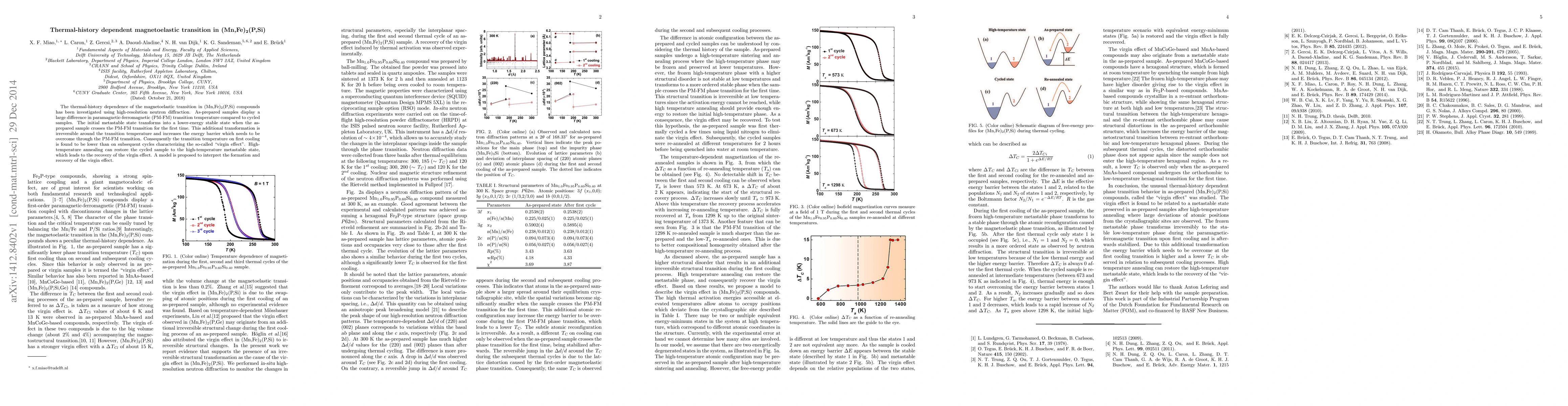 This study investigates the thermal-history dependent magnetoelastic transition in (Mn,Fe)2(P,Si) compounds, revealing that the initial metastable state transforms into a stable state upon first crossing the paramagnetic-ferromagnetic transition, leading to a lower transition temperature on subsequent cycles—the virgin effect. High-temperature annealing can restore the high-temperature metastable state and the virgin effect.