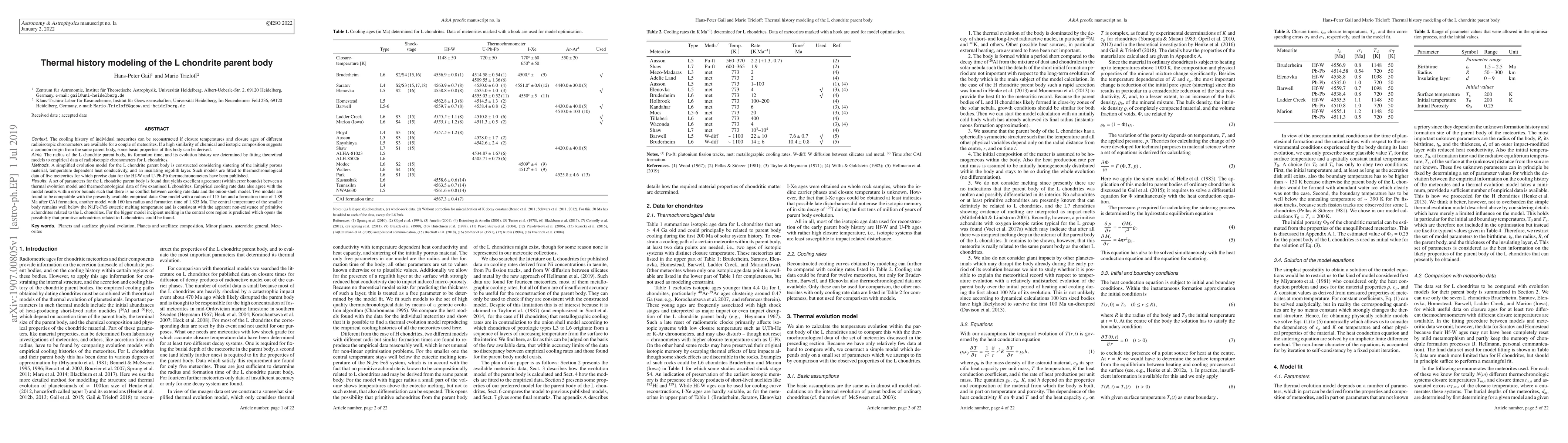This research models the thermal history of the L chondrite parent body using radioisotopic data, finding two compatible models: one with a 115 km radius and 1.89 Ma formation time, and another with 160 km radius and 1.835 Ma formation time. The smaller body avoids central melting, while the larger one may host primitive achondrites.