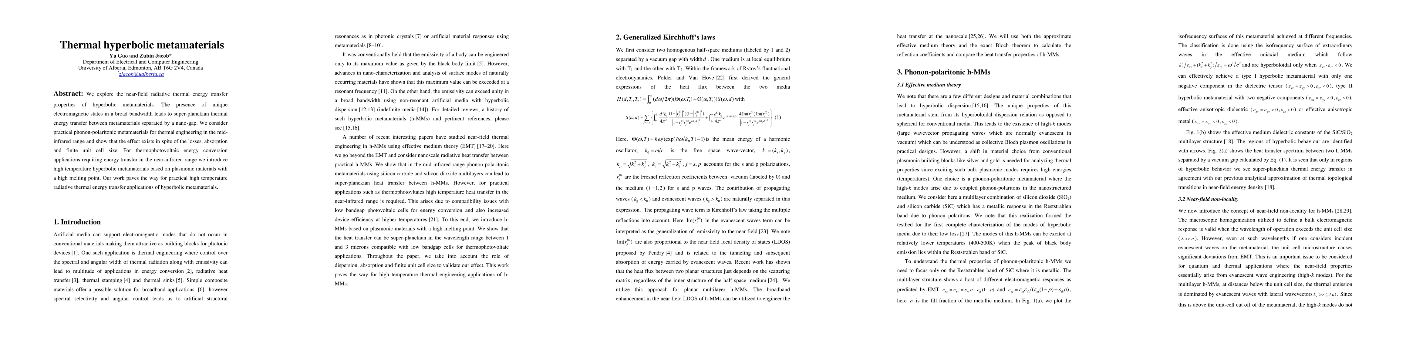 This paper investigates hyperbolic metamaterials' near-field radiative thermal energy transfer, demonstrating super-Planckian heat transfer across nano-gaps. It applies phonon-polaritonic metamaterials for mid-infrared thermal engineering and introduces high-temperature plasmonic metamaterials for near-infrared thermophotovoltaic applications, paving the way for advanced radiative thermal energy transfer technologies.
