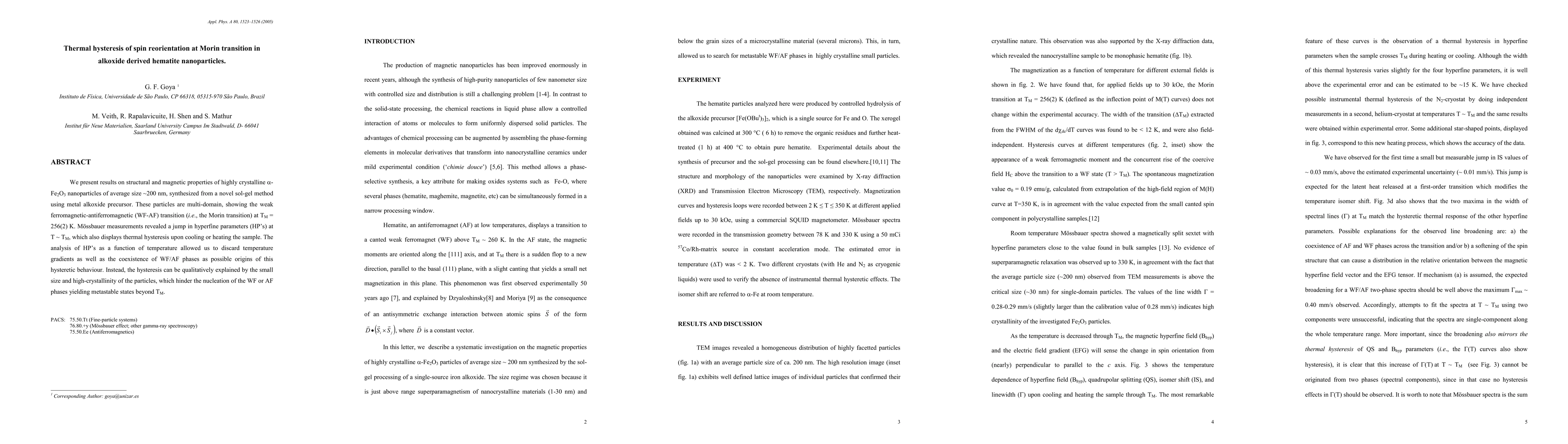 This study investigates the thermal hysteresis of spin reorientation in highly crystalline alpha-Fe2O3 nanoparticles synthesized via a novel sol-gel method, revealing a Morin transition at 256(2) K. The observed thermal hysteresis in hyperfine parameters is attributed to the nanoparticles' small size and high-crystallinity, which impede phase nucleation and create metastable states.