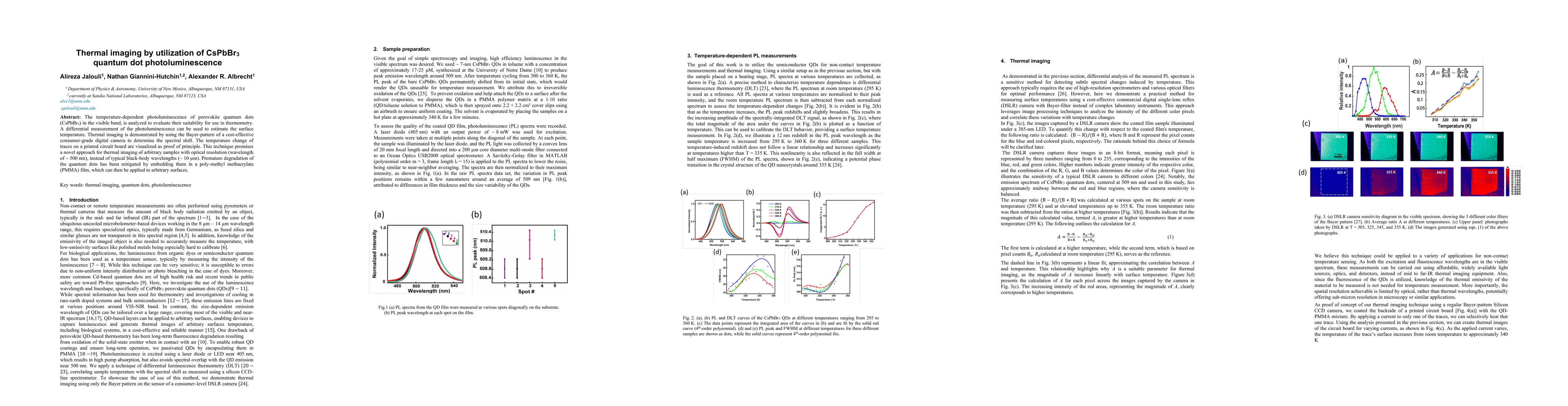 The temperature-dependent photoluminescence of perovskite quantum dots (CsPbBr3) in the visible band, is analyzed to evaluate their suitability for use in thermometry. A differential measurement of the photoluminescence can be used to estimate the surface temperature. Thermal imaging is demonstrated by using the Bayer-pattern of a cost-effective consumer-grade digital camera to determine the spectral shift. The temperature change of traces on a printed circuit board are visualized as proof of principle. This technique promises a novel approach for thermal imaging of arbitrary samples with optical resolution (wavelength of ~ 500 nm), instead of typical black-body wavelengths (~ 10 micrometer). Premature degradation of the quantum dots has been mitigated by embedding them in a poly-methyl methacrylate (PMMA) film, which can then be applied to arbitrary surfaces.
