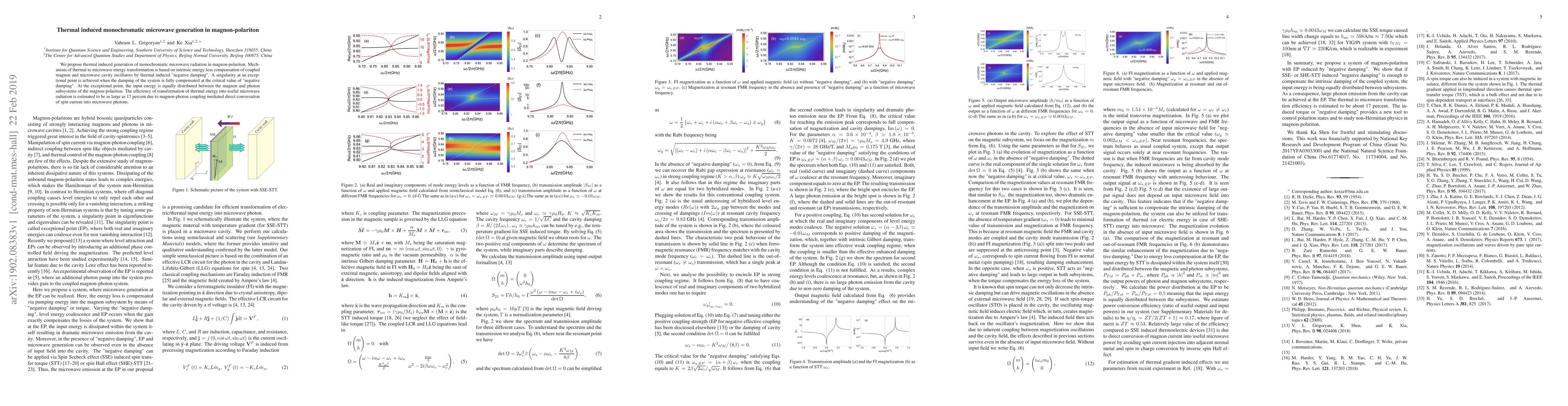 This paper proposes a method for generating monochromatic microwave radiation using thermal energy in magnon-polaritons, where thermal energy compensates for intrinsic energy loss through "negative damping." The system achieves an exceptional point of full damping compensation, enabling efficient conversion of thermal energy into microwave radiation with an estimated efficiency of 17 percent.