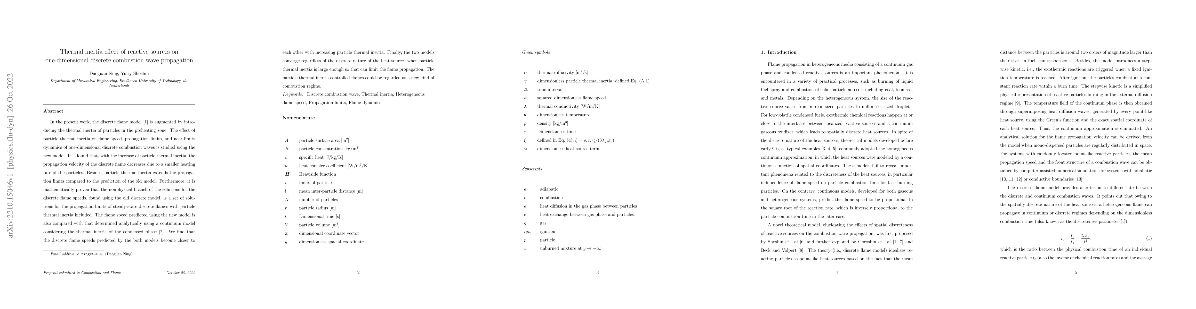 This paper introduces thermal inertia of particles in a discrete flame model to study its effect on one-dimensional combustion wave propagation. It finds that increased particle thermal inertia reduces flame speed and extends propagation limits, leading to a new kind of combustion regime.
