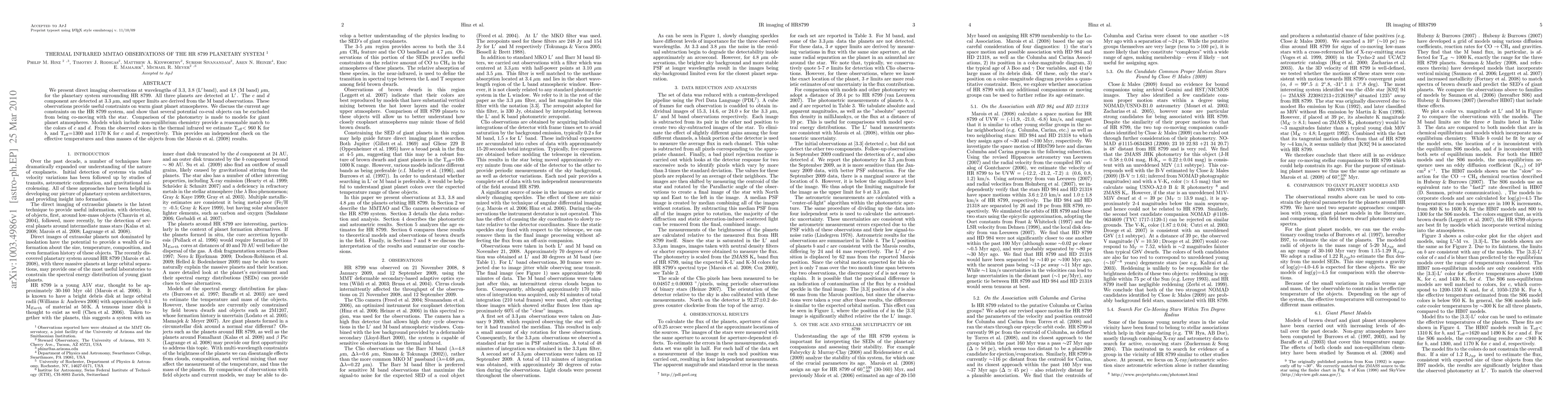 We present direct imaging observations at wavelengths of 3.3, 3.8 (L',band), and 4.8 (M band) microns, for the planetary system surrounding HR 8799. All three planets are detected at L'. The c and d component are detected at 3.3 microns, and upper limits are derived from the M band observations. These observations provide useful constraints on warm giant planet atmospheres. We discuss the current age constraints on the HR 8799 system, and show that several potential co-eval objects can be excluded from being co-moving with the star. Comparison of the photometry is made to models for giant planet atmospheres. Models which include non-equilibrium chemistry provide a reasonable match to the colors of c and d. From the observed colors in the thermal infrared we estimate T_eff < 960 K for b, and T_eff=1300 and 1170 K for c and d, respectively. This provides an independent check on the effective temperatures and thus masses of the objects from the Marois 2008 results.