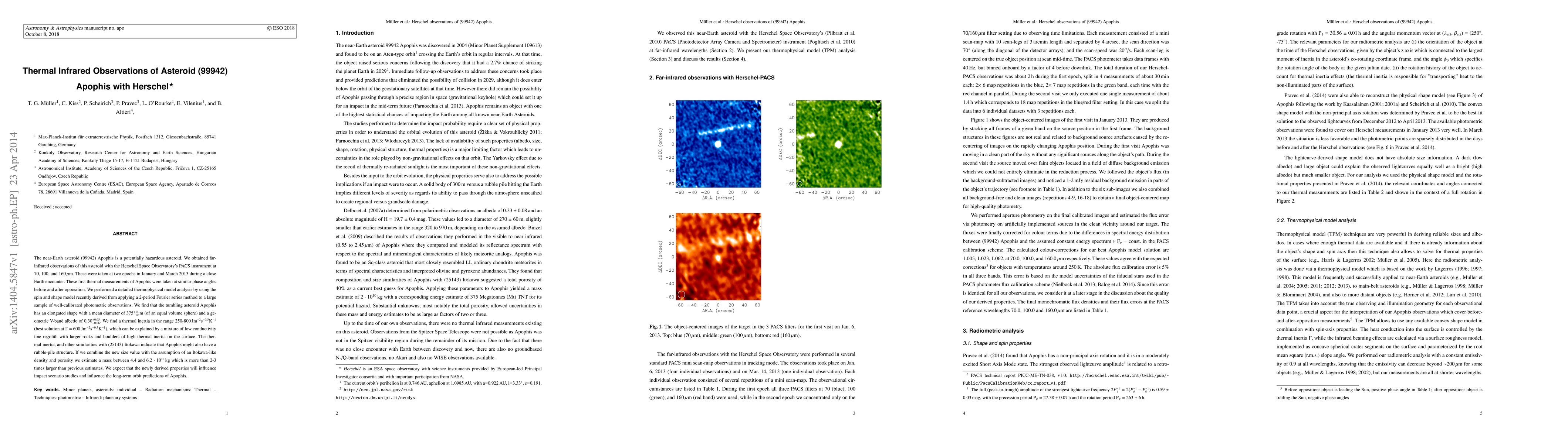 The Herschel Space Observatory provided the first thermal infrared observations of the near-Earth asteroid Apophis, revealing an elongated shape with a mean diameter of 375 m and a thermal inertia indicative of a rubble-pile structure. These new measurements significantly revise previous mass estimates, potentially impacting future impact scenario studies and orbit predictions.
