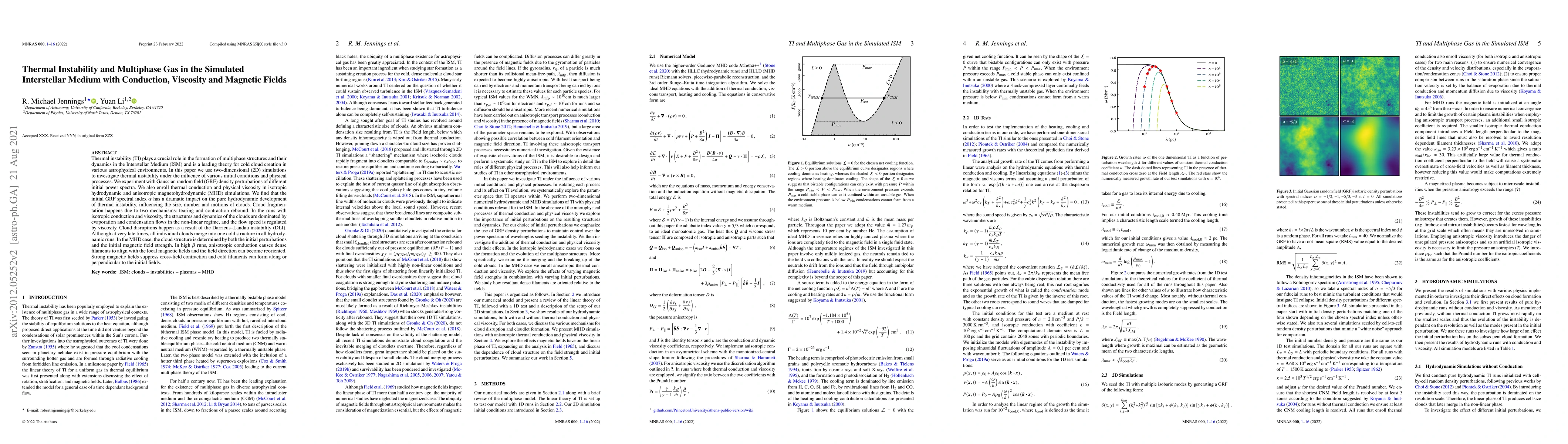 This paper investigates thermal instability in the Interstellar Medium using 2D simulations, considering conduction, viscosity, and magnetic fields. It finds that the initial density perturbations significantly affect cloud formation and dynamics, with cloud fragmentation occurring via tearing and contraction rebound. The presence of conduction and viscosity leads to cloud structures dominated by evaporation and condensation flows, while magnetic fields influence filament alignment and contraction.