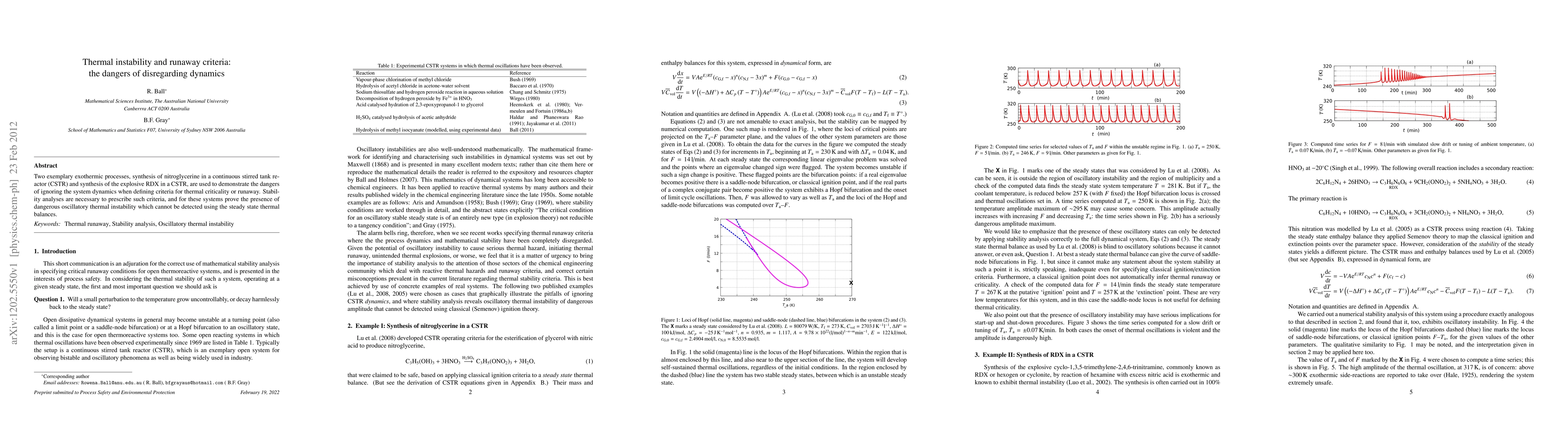 Two exemplary exothermic processes, synthesis of nitroglycerine in a continuous stirred tank reactor (CSTR) and synthesis of the explosive RDX in a CSTR, are used to demonstrate the dangers of ignoring the system dynamics when defining criteria for thermal criticality or runaway. Stability analyses are necessary to prescribe such criteria, and for these systems prove the presence of dangerous oscillatory thermal instability which cannot be detected using the steady state thermal balances.