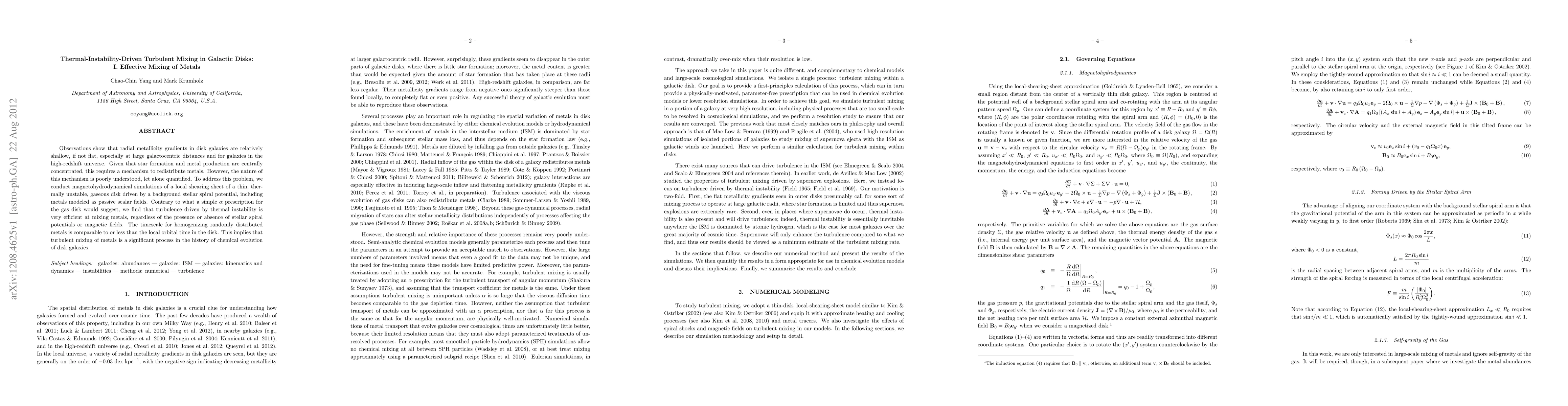 This paper investigates the efficient mixing of metals in galactic disks through turbulence driven by thermal instability, finding that it homogenizes metals on timescales comparable to local orbital times, suggesting a significant mechanism for chemical evolution in disk galaxies.