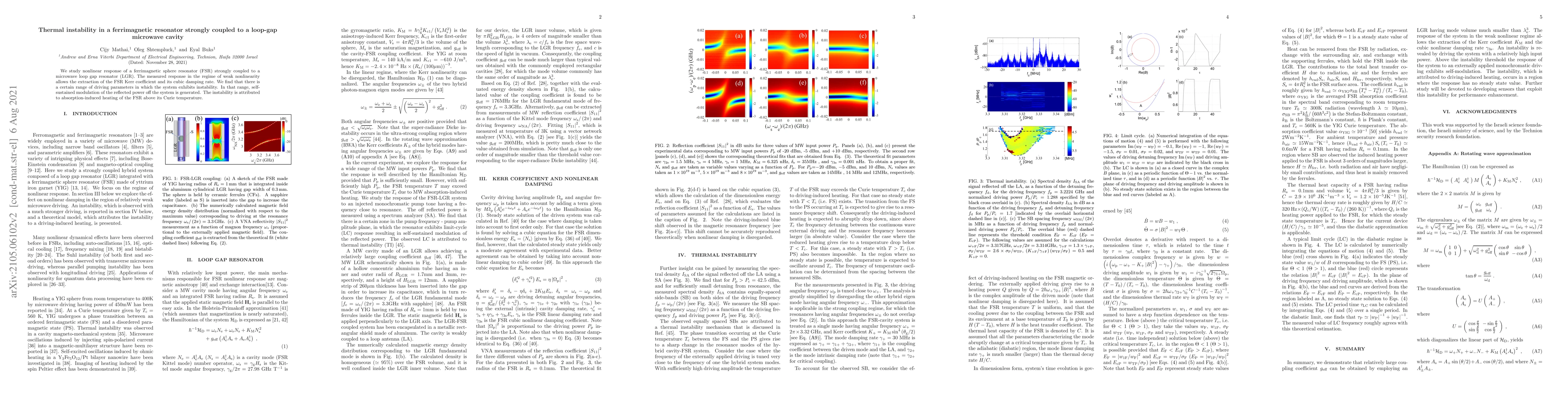 This paper investigates the nonlinear response of a ferrimagnetic sphere resonator coupled to a microwave loop-gap cavity, revealing a range of driving parameters where thermal instability occurs, leading to self-sustained modulation due to absorption-induced heating. The instability is linked to the ferrimagnetic sphere's temperature rising above its Curie point.