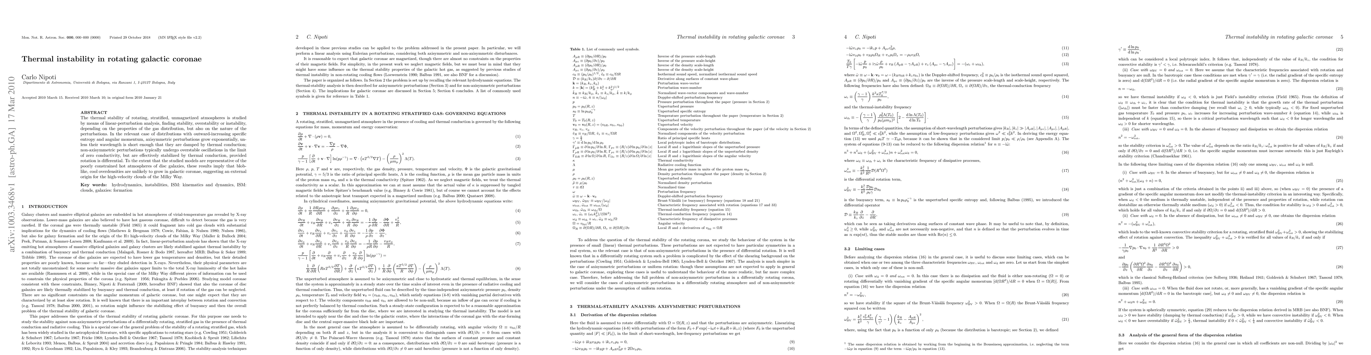 The thermal stability of rotating, stratified, unmagnetized atmospheres is studied by means of linear-perturbation analysis, finding stability, overstability or instability, depending on the properties of the gas distribution, but also on the nature of the perturbations. In the relevant case of distributions with outward-increasing specific entropy and angular momentum, axisymmetric perturbations grow exponentially, unless their wavelength is short enough that they are damped by thermal conduction; non-axisymmetric perturbations typically undergo overstable oscillations in the limit of zero conductivity, but are effectively stabilized by thermal conduction, provided rotation is differential. To the extent that the studied models are representative of the poorly constrained hot atmospheres of disc galaxies, these results imply that blob-like, cool overdensities are unlikely to grow in galactic coronae, suggesting an external origin for the high-velocity clouds of the Milky Way.