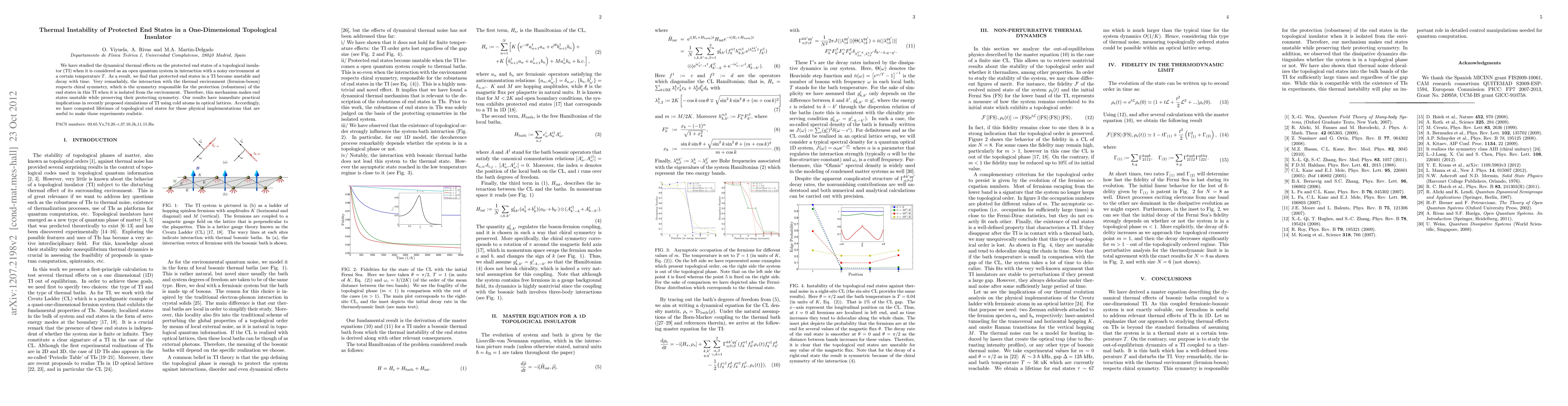 We have studied the dynamical thermal effects on the protected end states of a topological insula- tor (TI) when it is considered as an open quantum system in interaction with a noisy environment at a certain temperature T . As a result, we find that protected end states in a TI become unstable and decay with time. Very remarkably, the interaction with the thermal environment (fermion-boson) respects chiral symmetry, which is the symmetry responsible for the protection (robustness) of the end states in this TI when it is isolated from the environment. Therefore, this mechanism makes end states unstable while preserving their protecting symmetry. Our results have immediate practical implications in recently proposed simulations of TI using cold atoms in optical lattices. Accordingly, we have computed lifetimes of topological end states for these physical implementations that are useful to make those experiments realistic.