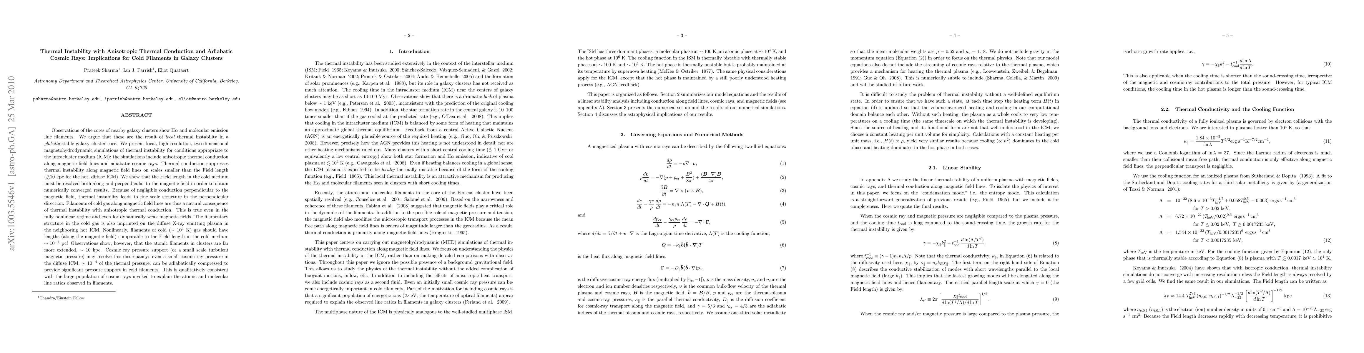 Observations of the cores of nearby galaxy clusters show H$\alpha$ and molecular emission line filaments. We argue that these are the result of {\em local} thermal instability in a {\em globally} stable galaxy cluster core. We present local, high resolution, two-dimensional magnetohydrodynamic simulations of thermal instability for conditions appropriate to the intracluster medium (ICM); the simulations include thermal conduction along magnetic field lines and adiabatic cosmic rays. Thermal conduction suppresses thermal instability along magnetic field lines on scales smaller than the Field length ($\gtrsim$10 kpc for the hot, diffuse ICM). We show that the Field length in the cold medium must be resolved both along and perpendicular to the magnetic field in order to obtain numerically converged results. Because of negligible conduction perpendicular to the magnetic field, thermal instability leads to fine scale structure in the perpendicular direction. Filaments of cold gas along magnetic field lines are thus a natural consequence of thermal instability with anisotropic thermal conduction. Nonlinearly, filaments of cold ($\sim 10^4$ K) gas should have lengths (along the magnetic field) comparable to the Field length in the cold medium $\sim 10^{-4}$ pc! Observations show, however, that the atomic filaments in clusters are far more extended, $\sim 10$ kpc. Cosmic ray pressure support (or a small scale turbulent magnetic pressure) may resolve this discrepancy: even a small cosmic ray pressure in the diffuse ICM, $\sim 10^{-4}$ of the thermal pressure, can be adiabatically compressed to provide significant pressure support in cold filaments. This is qualitatively consistent with the large population of cosmic rays invoked to explain the atomic and molecular line ratios observed in filaments.