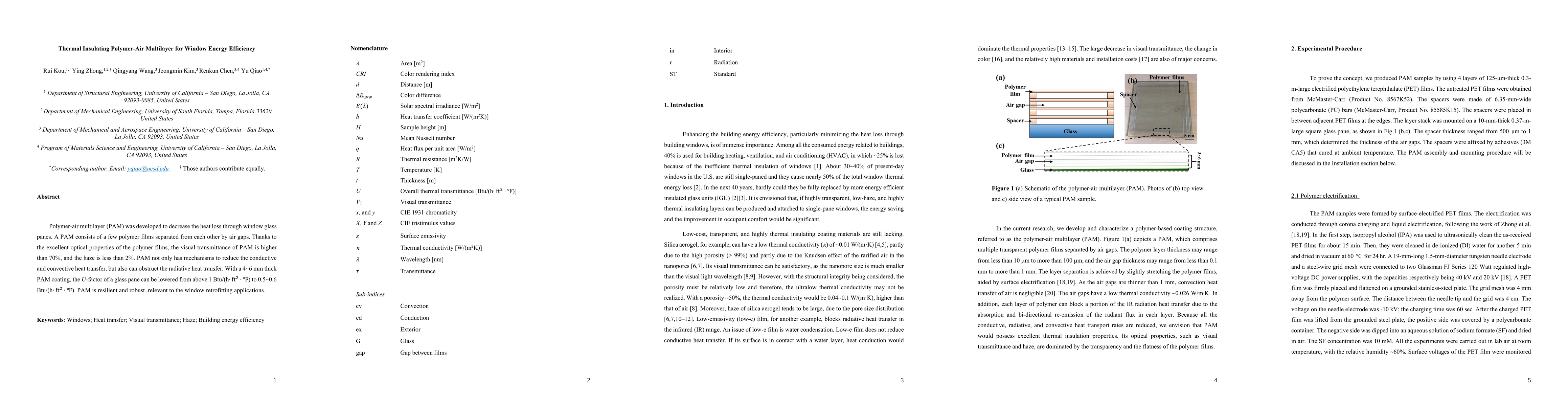 Polymer-air multilayer (PAM) was developed to decrease the heat loss through window glass panes. A PAM consists of a few polymer films separated from each other by air gaps. Thanks to the excellent optical properties of the polymer films, the visual transmittance of PAM is higher than 70%, and the haze is less than 2%. PAM not only has mechanisms to reduce the conductive and convective heat transfer, but also can obstruct the radiative heat transfer. With a 4~6 mm thick PAM coating, the U-factor of a glass pane can be lowered from above 1 Btu/{{h}{ft}^2{{\deg}F}} to 0.5~0.6 Btu/{{h}{ft}^2{{\deg}F}} .PAM is resilient and robust, relevant to the window retrofitting applications.