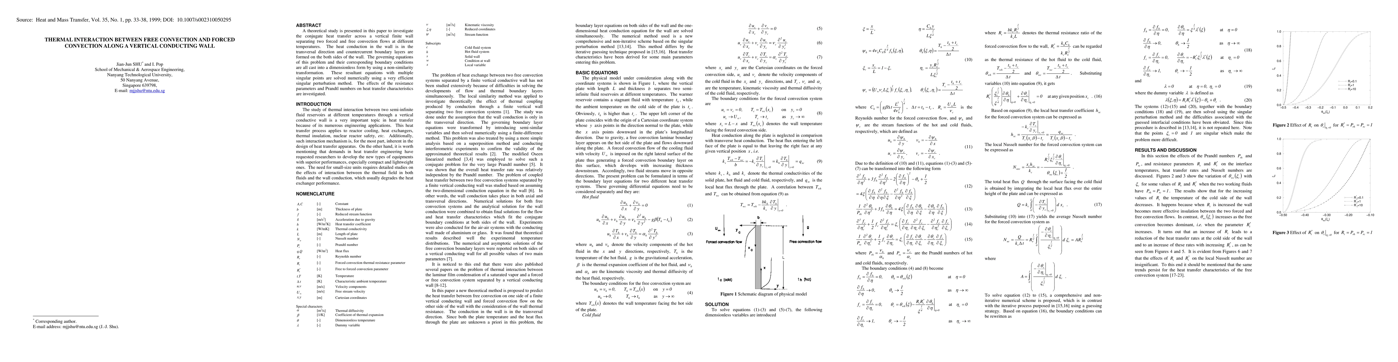 This paper investigates the conjugate heat transfer in a vertical conducting wall separating forced and free convection flows through theoretical modeling and numerical solution, focusing on the effects of resistance parameters and Prandtl numbers on heat transfer characteristics. The problem is solved using a non-similarity transformation and a singular perturbation method.