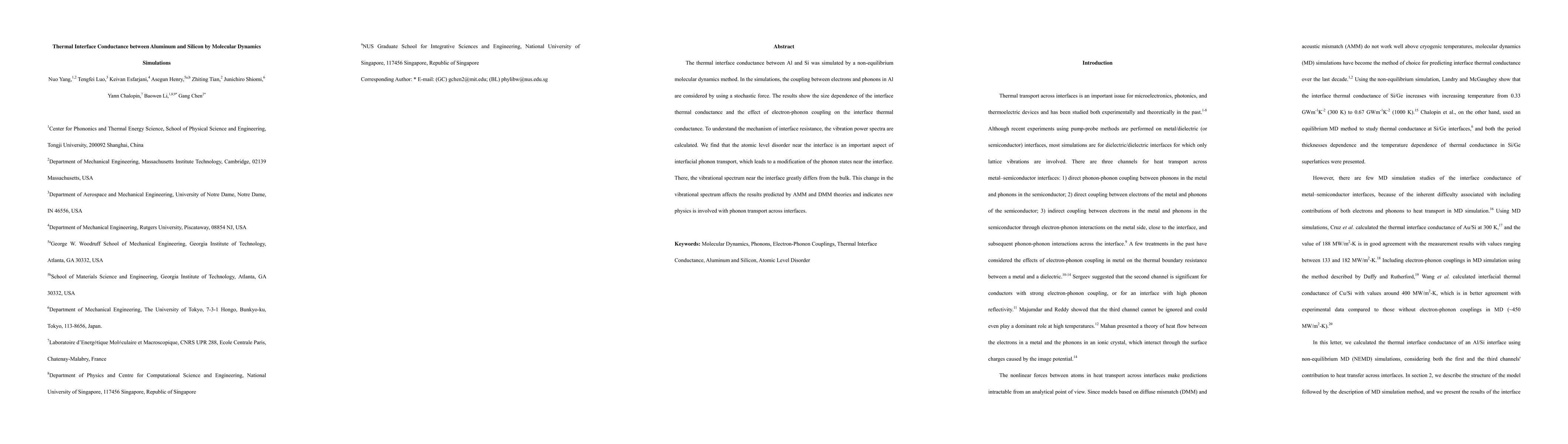 Summary: This study uses non-equilibrium molecular dynamics to simulate thermal interface conductance between aluminum and silicon, revealing size dependence and electron-phonon coupling effects. Atomic level disorder near the interface modifies phonon states, indicating new physics in interfacial phonon transport.