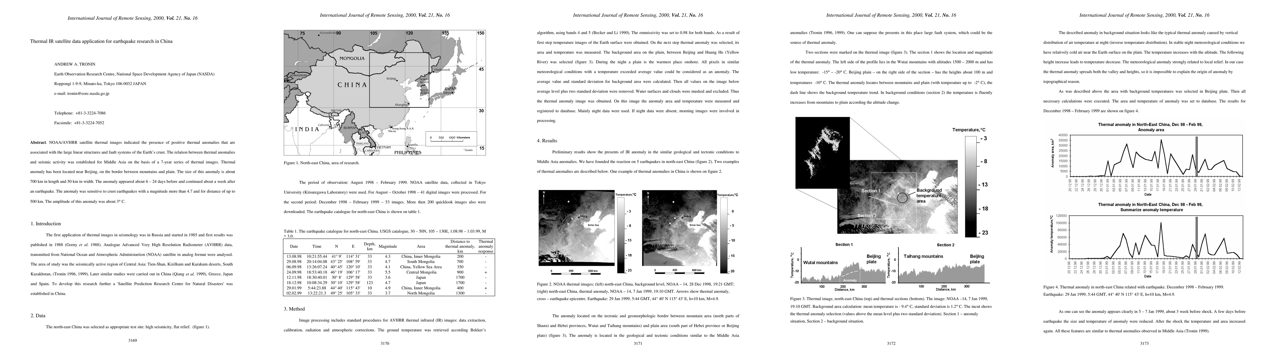 NOAA/AVHRR thermal images indicated the presence of positive thermal anomalies that are associated with the large linear structures and fault systems of the Earth's crust. The relation between thermal anomalies and seismic activity was established for Middle Asia on the basis of a 7-year series of thermal images. Thermal anomaly has been located near Beijing, on the border between the mountains and plain. The size of this anomaly is about 700 km long and 50 km wide. The anomaly appeared about 6-24 days before and continued about a week after an earthquake. The anomaly was sensitive to crust earthquakes with a magnitude more than 4.7 and for a distance of up to 500 km. The amplitude of this anomaly was about 3 C.