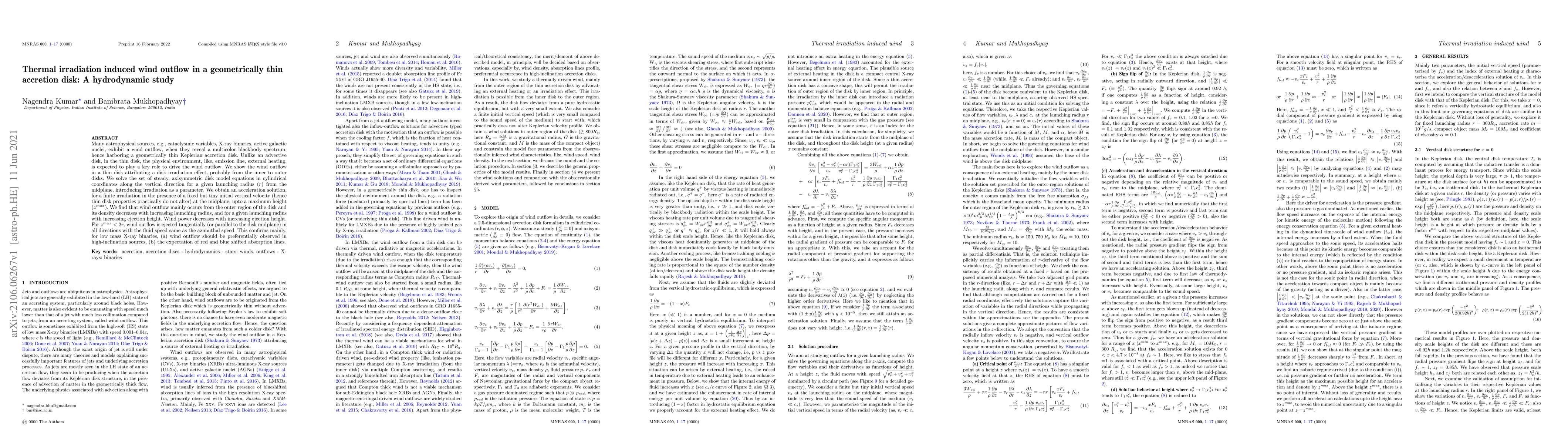 Many astrophysical sources, e.g., cataclysmic variables, X-ray binaries, active galactic nuclei, exhibit a wind outflow, when they reveal a multicolor blackbody spectrum, hence harboring a geometrically thin Keplerian accretion disk. Unlike an advective disk, in the thin disk, the physical environment, like, emission line, external heating, is expected to play a key role to drive the wind outflow. We show the wind outflow in a thin disk attributing a disk irradiation effect, probably from the inner to outer disks. We solve the set of steady, axisymmetric disk model equations in cylindrical coordinates along the vertical direction for a given launching radius $(r)$ from the midplane, introducing irradiation as a parameter. We obtain an acceleration solution, for a finite irradiation in the presence of a fixed but tiny initial vertical velocity (hence thin disk properties practically do not alter) at the midplane, upto a maximum height ($z^{max}$). We find that wind outflow mainly occurs from the outer region of the disk and its density decreases with increasing launching radius, and for a given launching radius with increasing ejection height. Wind power decreases with increasing ejection height. For $z^{max} < 2r$, wind outflow is ejected tangentially (or parallel to the disk midplane) in all directions with the fluid speed same as the azimuthal speed. This confirms mainly, for low mass X-ray binaries, (a) wind outflow should be preferentially observed in high-inclination sources, (b) the expectation of red and blue shifted absorption lines.
