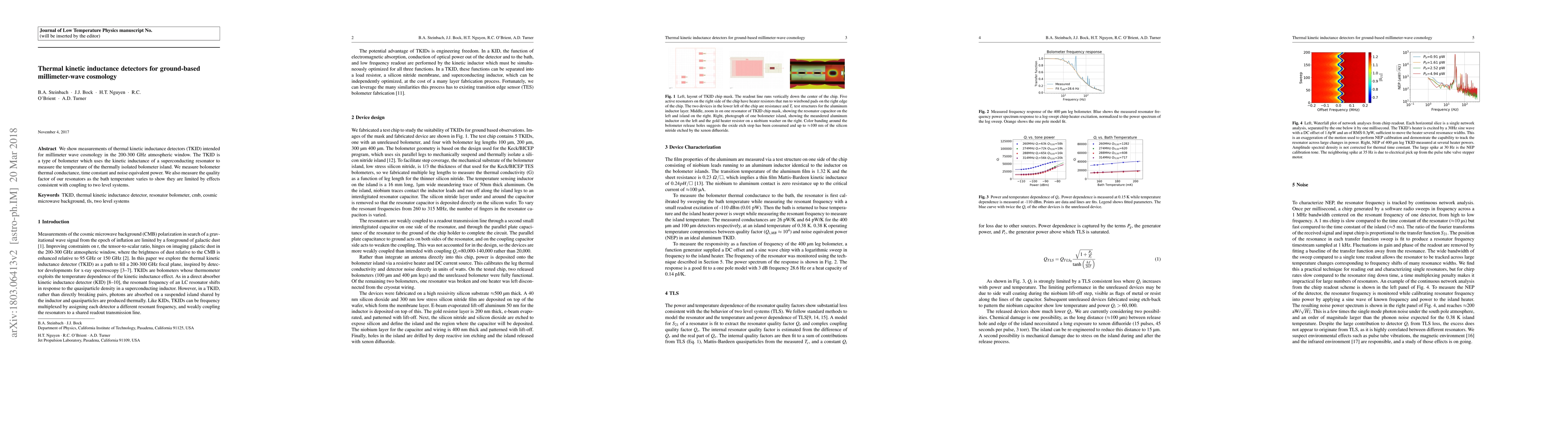 This paper presents measurements of thermal kinetic inductance detectors (TKID) for millimeter-wave cosmology, demonstrating their performance in the 200-300 GHz atmospheric window. The study evaluates bolometer thermal conductance, time constant, and noise equivalent power, and finds that resonator quality factors are limited by coupling to two-level systems.