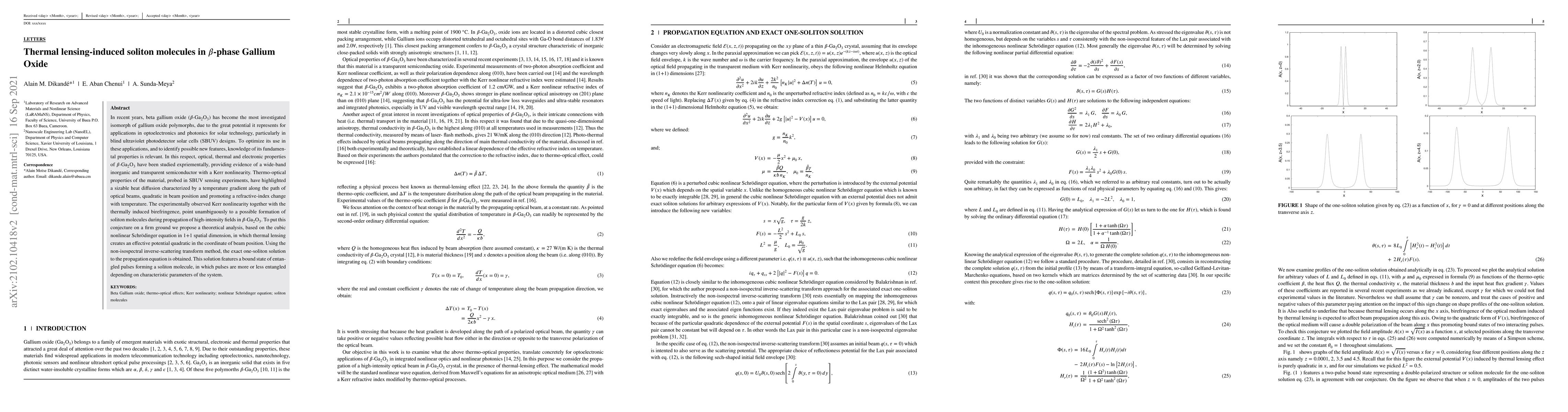 In recent years, beta gallium oxide (beta-\ce{Ga2O3}) has become the most investigated isomorph of gallium oxide polymorphs, due to the great potential it represents for applications in optoelectronics and photonics for solar technology, particularly in blind ultraviolet photodetector solar cells (SBUV) designs. To optimize its use in these applications, and to identify possible new features, knowledge of its fundamental properties is relevant. In this respect, optical, thermal and electronic properties of beta-\ce{Ga2O3} have been studied expriementally, providing evidence of a wide-band inorganic and transparent semiconductor with a Kerr nonlinearity. Thermo-optical properties of the material, probed in SBUV sensing experiments, have highlighted a sizable heat diffusion characterized by a temperature gradient along the path of optical beams, quadratic in beam position and promoting a refractive-index change with temperature. The experimentally observed Kerr nonlinearity together with the thermally induced birefringence, point unambiguously to a possible formation of soliton molecules during propagation of high-intensity fields in beta-\ce{Ga2O3}. To put this conjecture on a firm ground we propose a theoretical analysis, based on the cubic nonlinear Schroedinger equation in 1+1 spatial dimension, in which thermal lensing creates an effective potential quadratic in the coordinate of beam position. Using the non-isospectral inverse-scattering transform method, the exact one-soliton solution to the propagation equation is obtained. This solution features a bound state of entangled pulses forming a soliton molecule, in which pulses are more or less entangled depending on characteristic parameters of the system.