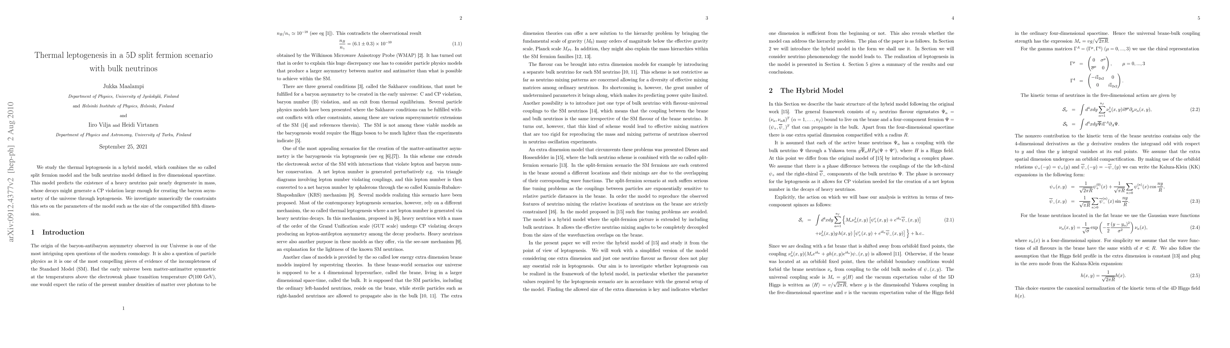 This paper explores thermal leptogenesis in a 5D hybrid model combining split fermions and bulk neutrinos, predicting nearly degenerate heavy neutrinos that could generate sufficient CP violation for generating the universe's baryon asymmetry. Numerical analysis determines the model's parameter constraints, including the fifth dimension's size.