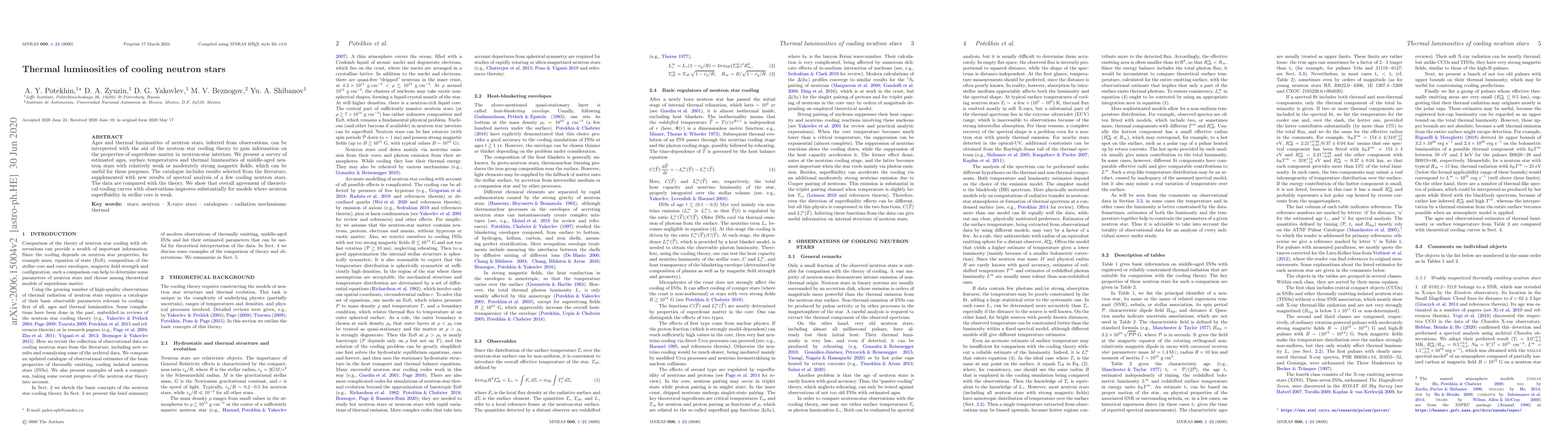 This paper surveys the ages, surface temperatures, and thermal luminosities of middle-aged neutron stars, using both literature data and new spectral analysis, to test neutron star cooling models. It finds that models with weak neutron superfluidity in the core show better agreement with observed cooling curves.