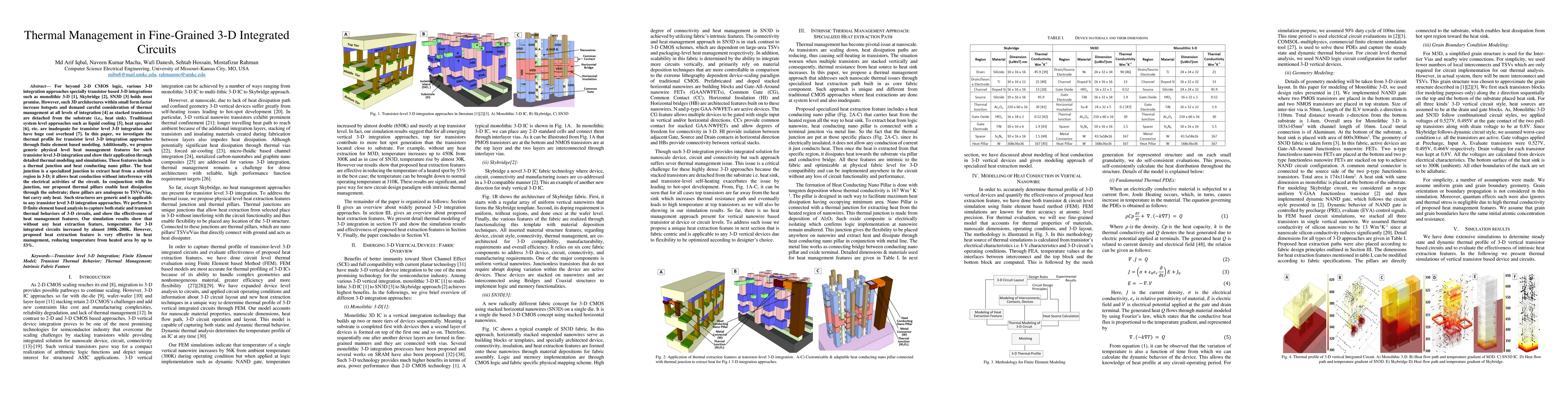 This paper investigates thermal management in 3-D integrated circuits using finite element modeling and proposes heat management features like thermal junctions and heat conducting nano pillars. The simulations show that these features can reduce temperature increases by up to 53%, addressing the thermal challenges of 3-D integration.