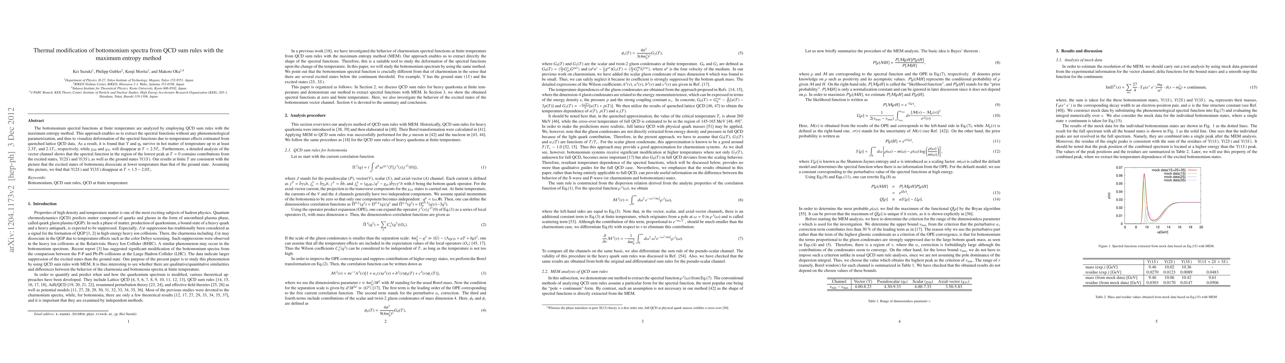 This study uses QCD sum rules and the maximum entropy method to analyze bottomonium spectral functions at finite temperatures, revealing that \Upsilon and \eta_b persist up to 2.3T_c and 2.1T_c respectively, while \chi_{b0} and \chi_{b1} vanish at T<2.5T_c. The vector channel analysis indicates that excited states like \Upsilon(2S) and \Upsilon(3S) dissociate at lower temperatures than the ground state.