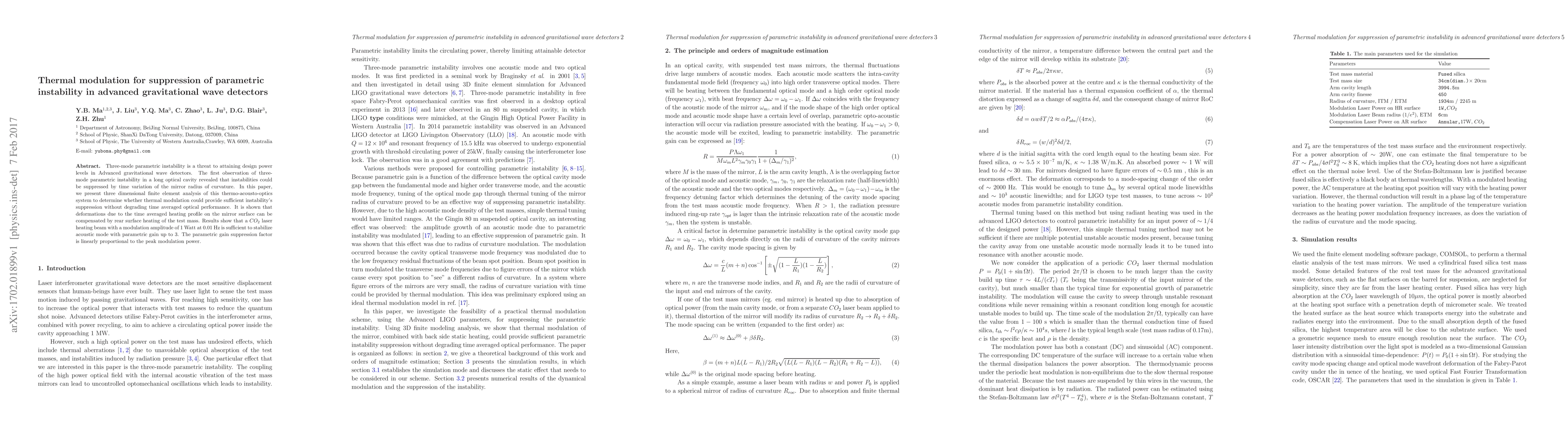 Three-mode parametric instability is a threat to attaining design power levels in Advanced gravitational wave detectors. The first observation of three-mode parametric instability in a long optical cavity revealed that instabilities could be suppressed by time variation of the mirror radius of curvature. In this paper, we present three dimensional finite element analysis of this thermo-acousto-optics system to determine whether thermal modulation could provide sufficient instability's suppression without degrading time averaged optical performance. It is shown that deformations due to the time averaged heating profile on the mirror surface can be compensated by rear surface heating of the test mass. Results show that a $CO_2$ laser heating beam with a modulation amplitude of $1$ Watt at 0.01 Hz is sufficient to stabilize acoustic mode with parametric gain up to 3. The parametric gain suppression factor is linearly proportional to the peak modulation power.
