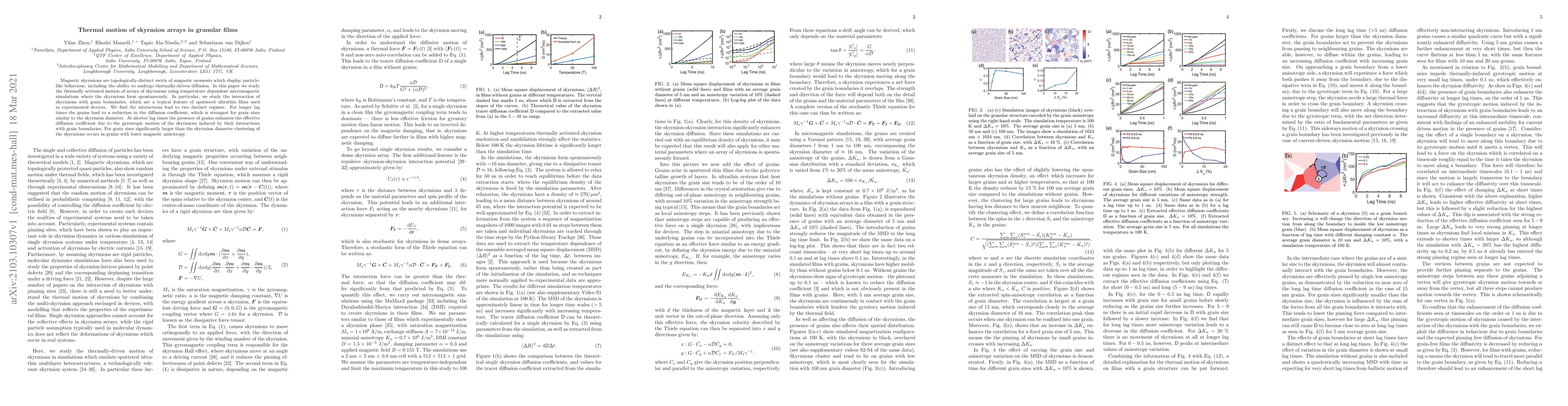Researchers studied the thermal motion of skyrmions in granular films, finding that grain boundaries can either slow down or speed up their movement, depending on the grain size and magnetic anisotropy.
